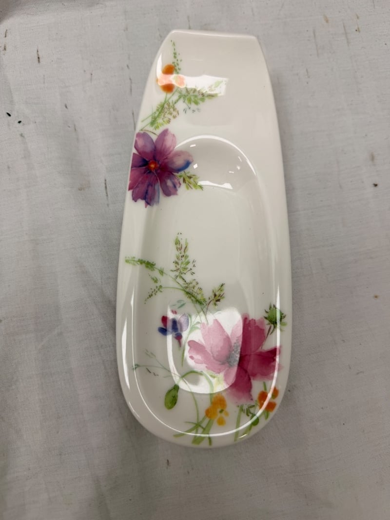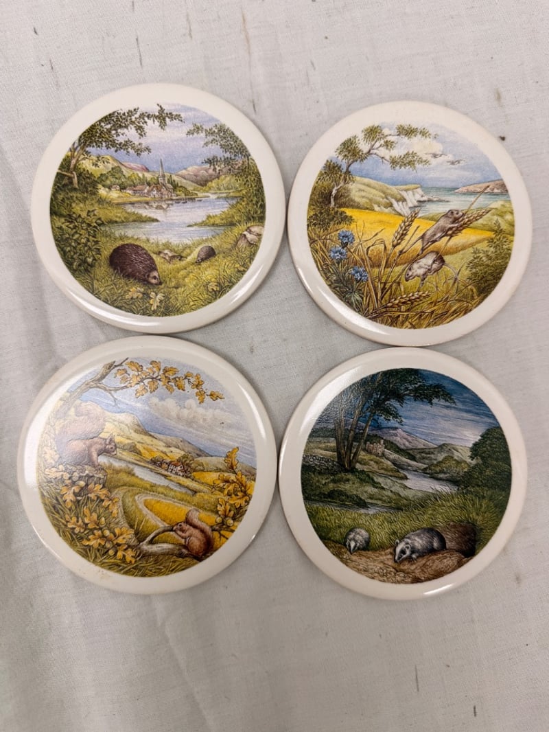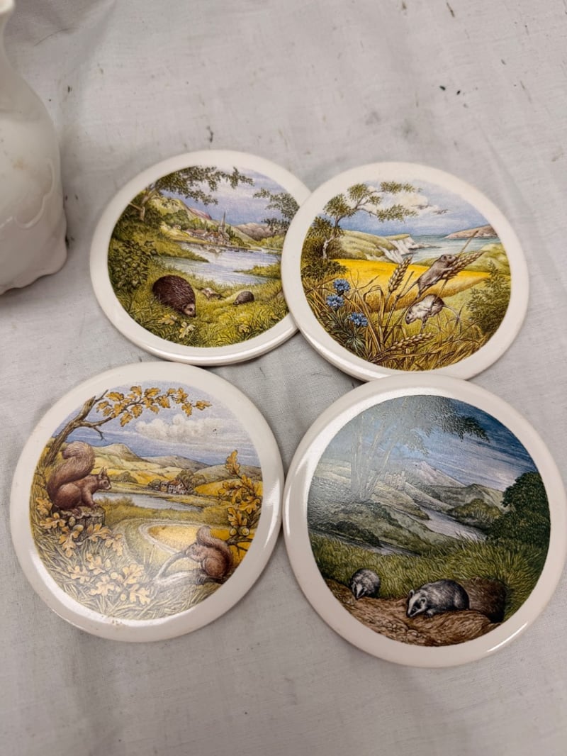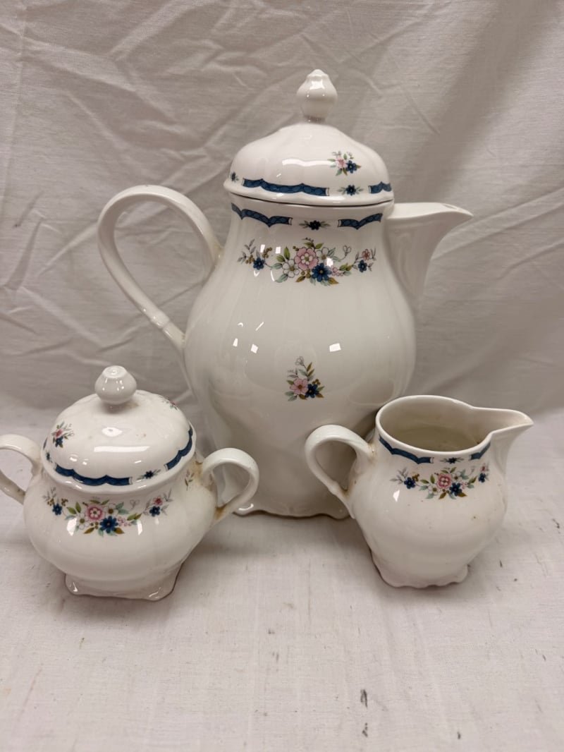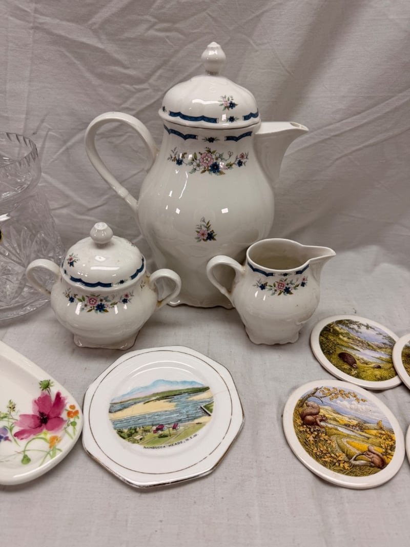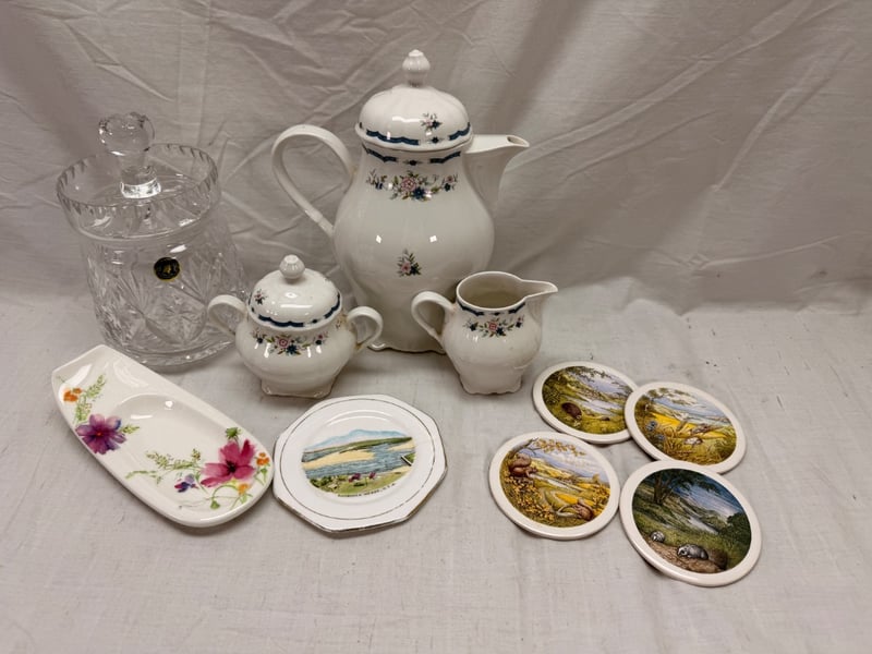 TEA SET WITH DECORATIVE COASTERS AND CUT GLASS BARREL