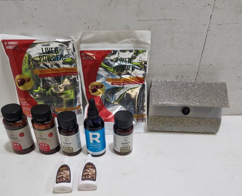 Assorted lot, includes ruby kit diamonte like clutch bag, liver powder health products, and more....... Qty to lot Sold as lot