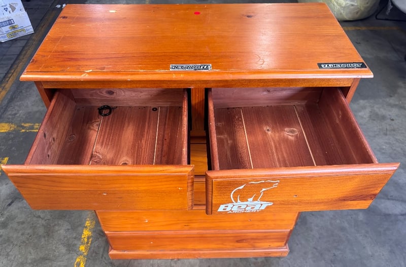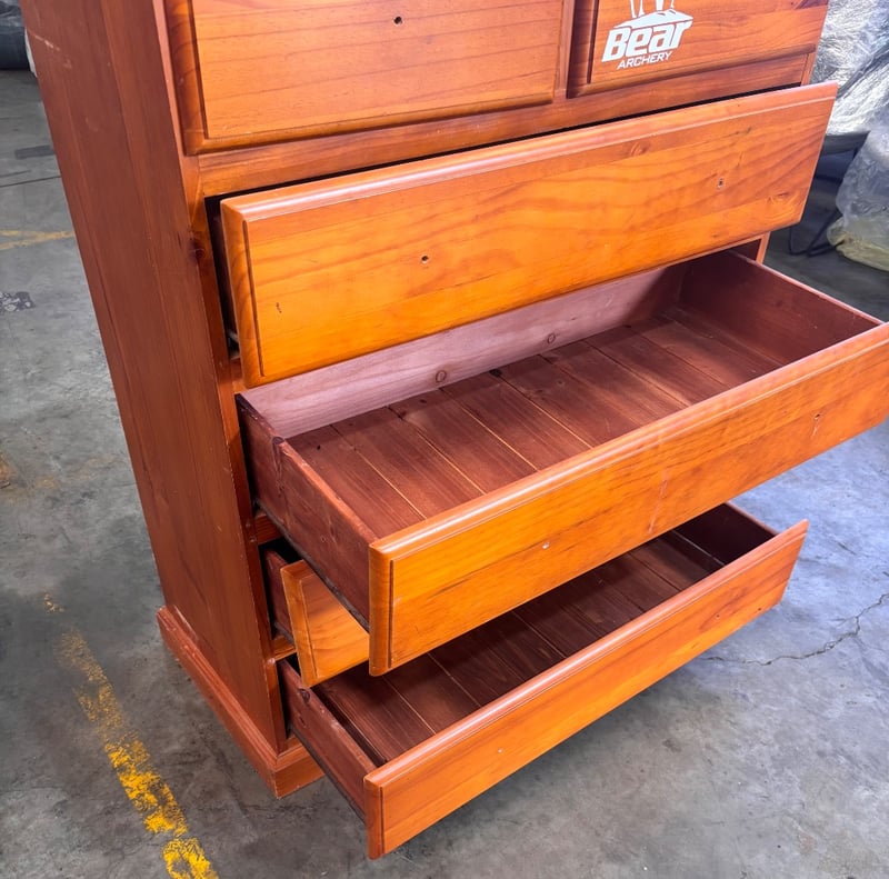 Wooden set of drawersNote; No handles, some drawers are stiff to open, scratches and scuffs, inspection recommended