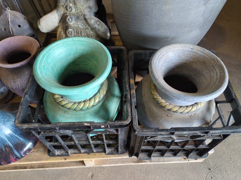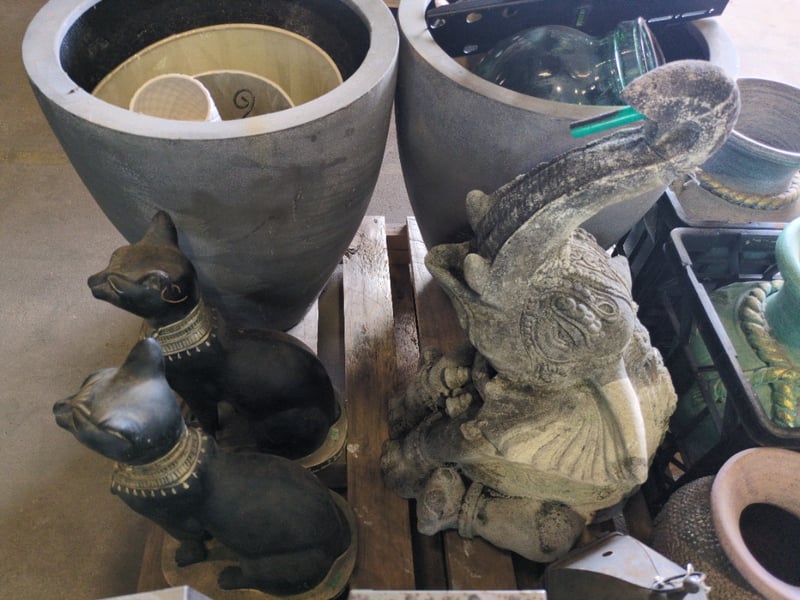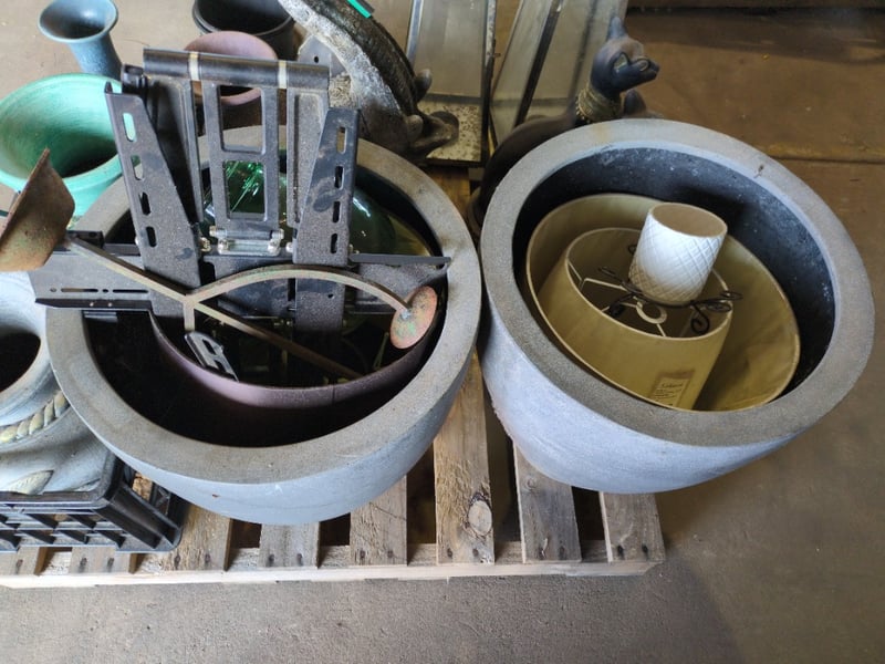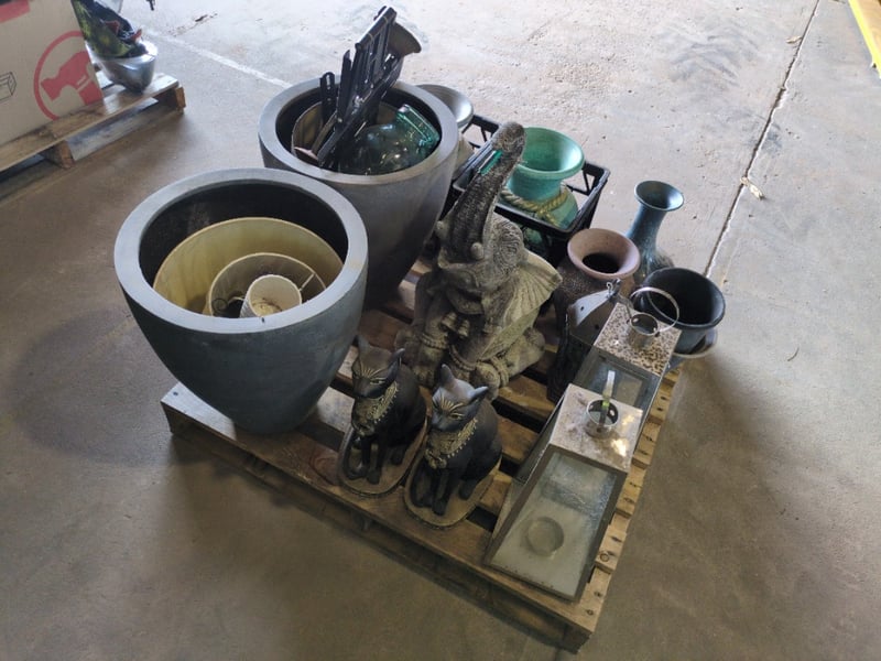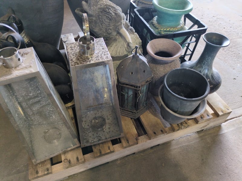 Pallet with Various and Assorted Decorative Garden Pieces. Vases, Candle Holders and More. Sold as Lot.