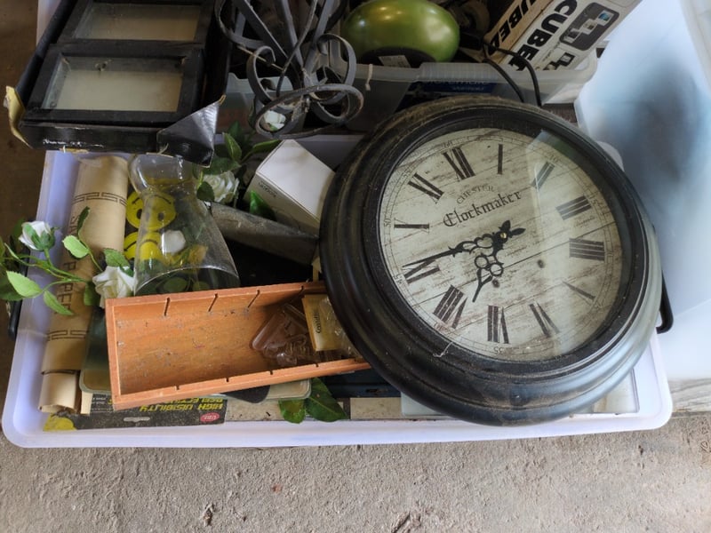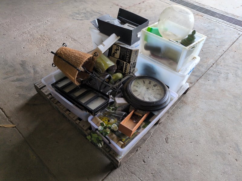 Pallet with Various and Assorted Household Items including a Chester Clock, Lamps and More. Used Condition. Sold as Lot.