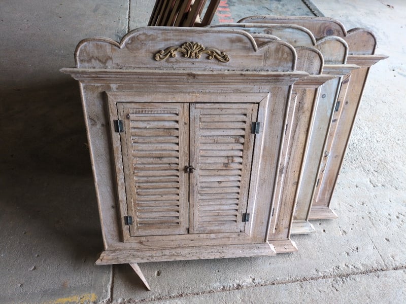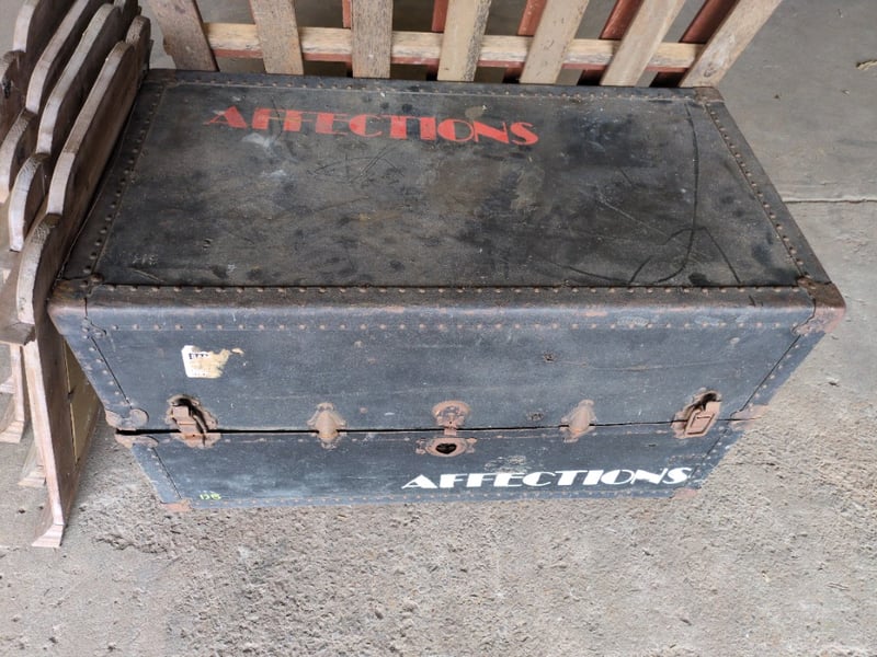 Black Steamer Trunk, Provincial Shutter Windows and Wooden Gate. Sold as Lot.