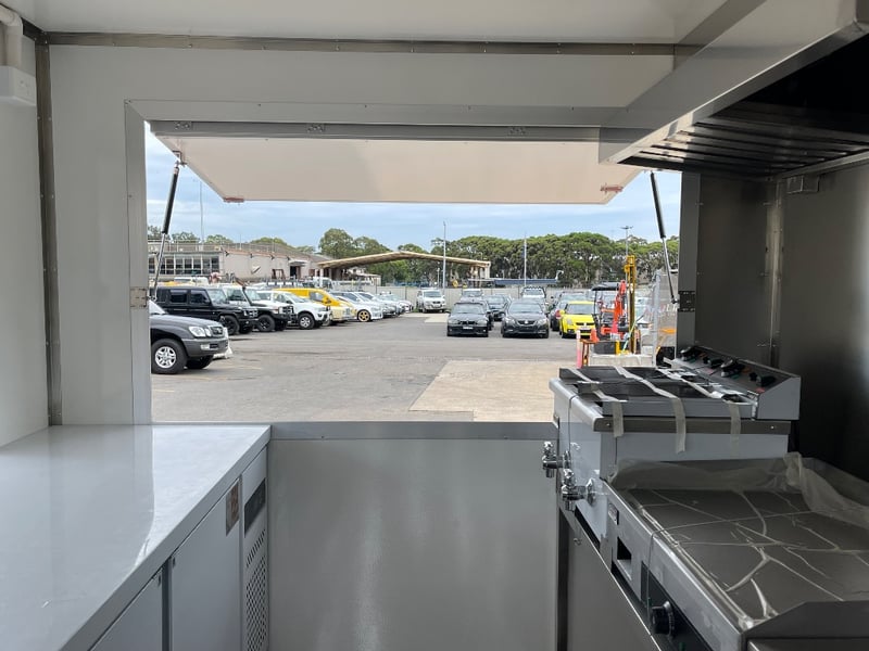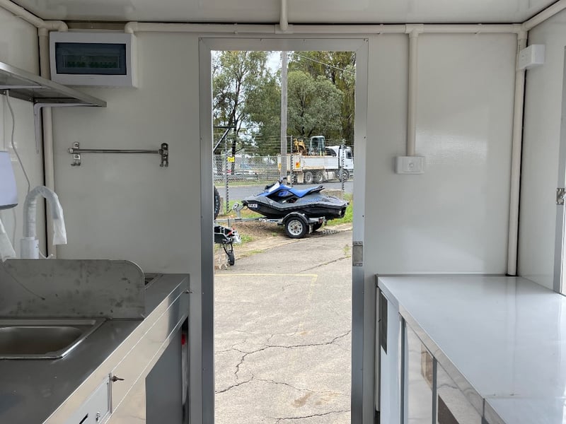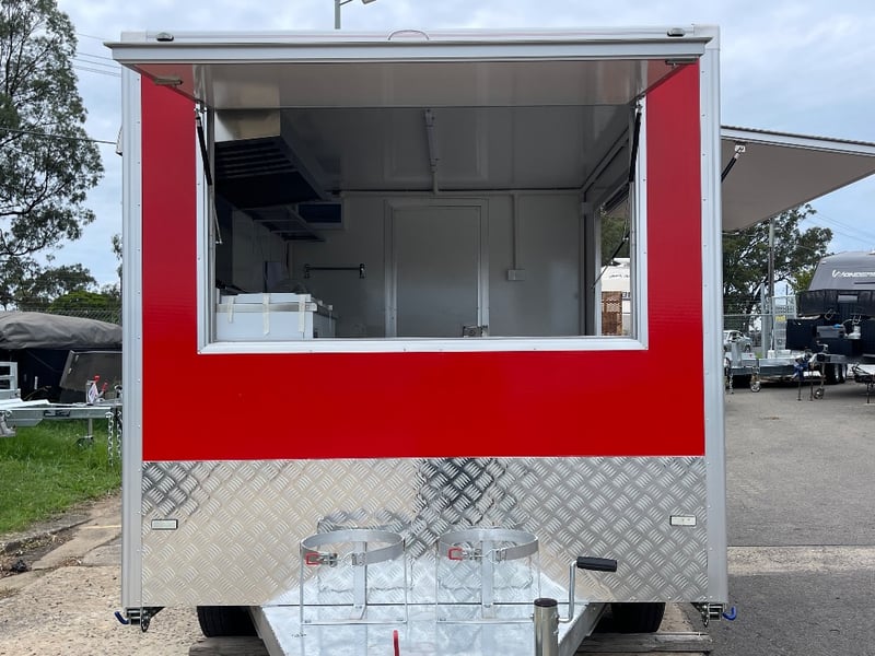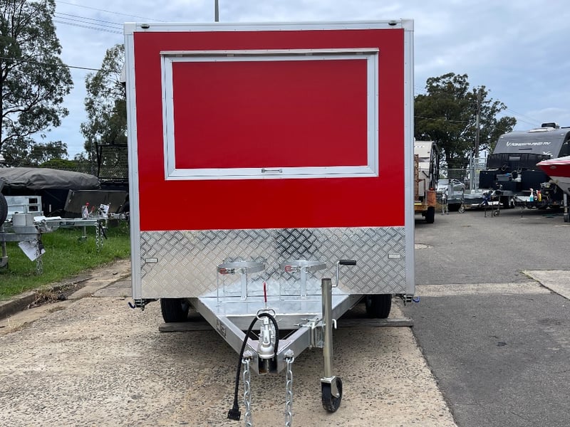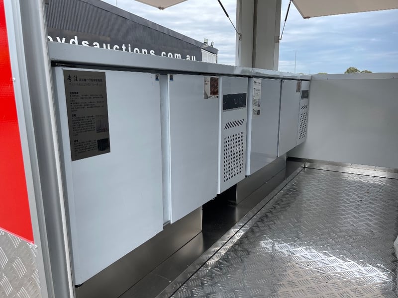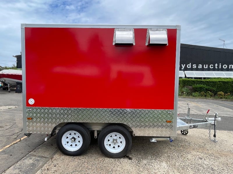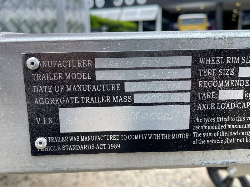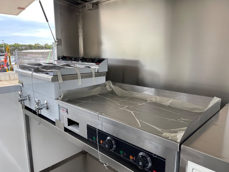 Description: Equipment and Internal Fit Out: Aluminium Checker Plate Non-Slip Flooring with Drain for Easy Cleaning, 2 x 30 Litre Water Tanks and 20 Litre Waste Tank, Double Bowl Sink with Hot and Cold Water and Additional Sink, suitable for Hand Washing or Rinsing with Hot and Cold Water, Stainless Steel Bench Tops, Under Bench Type 2 Door Freezer with Stainless Steel Top, Under Bench Type 2 Door Refrigerator with Stainless Steel Top, Electric 12 Litre Double Fryer, 730mm Hot plate, Stainless Steel Rangehood/Exhaust 1350mm, Cash Draw, Window Openings: 1 x 940mm (H) x 1600mm (W), 1 x 940mm (H) x 2090mm (W) Lift Up Service Windows, Fibreglass Body Panels with Thermal Insulation, Rear Door with Lock, chassis and Frame Constructed with Galvanised Steel, Electrical Brakes Fitted (not connected), Brakes Override Mechanical Braking System, Electrical: LED Tail Lights, 1 x LED Internal Lights, Fully Wired with Circuit Board (to be tested by qualified electrician), Heavy Duty Jockey wheel.