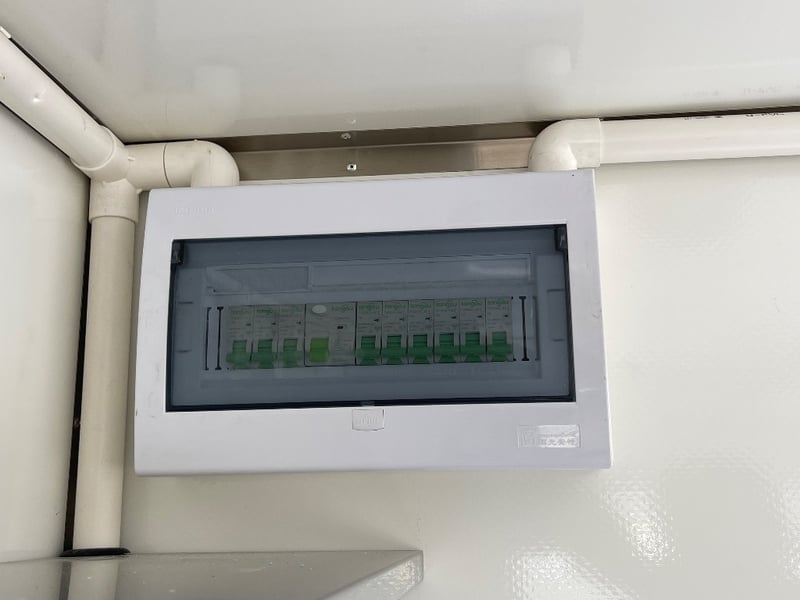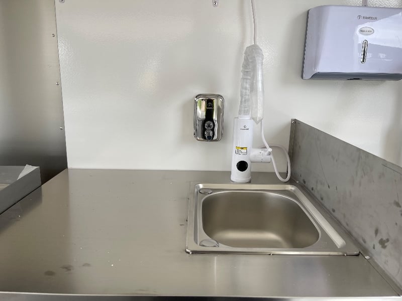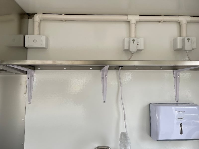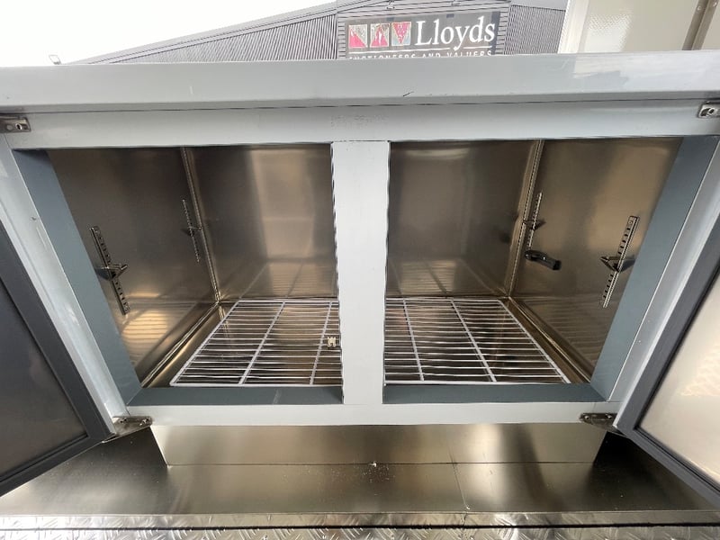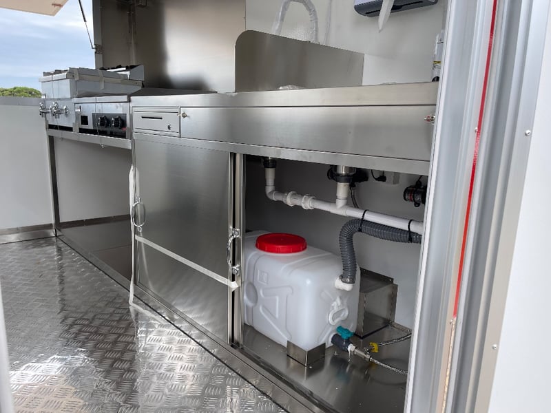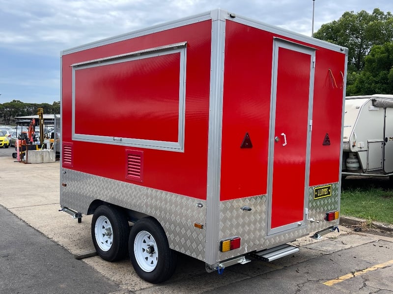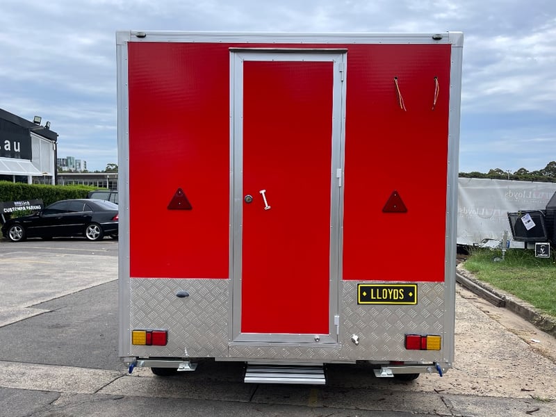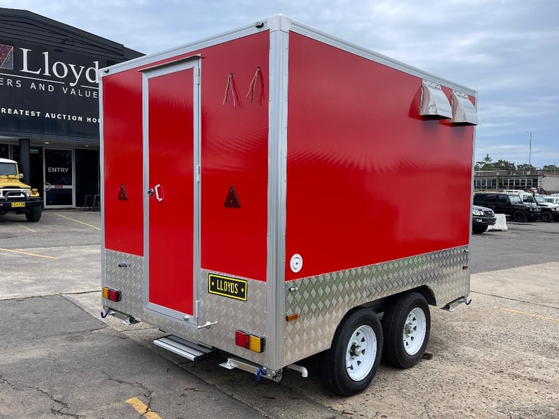 Description: Equipment and Internal Fit Out: Aluminium Checker Plate Non-Slip Flooring with Drain for Easy Cleaning, 2 x 30 Litre Water Tanks and 20 Litre Waste Tank, Double Bowl Sink with Hot and Cold Water and Additional Sink, suitable for Hand Washing or Rinsing with Hot and Cold Water, Stainless Steel Bench Tops, Under Bench Type 2 Door Freezer with Stainless Steel Top, Under Bench Type 2 Door Refrigerator with Stainless Steel Top, Electric 12 Litre Double Fryer, 730mm Hot plate, Stainless Steel Rangehood/Exhaust 1350mm, Cash Draw, Window Openings: 1 x 940mm (H) x 1600mm (W), 1 x 940mm (H) x 2090mm (W) Lift Up Service Windows, Fibreglass Body Panels with Thermal Insulation, Rear Door with Lock, chassis and Frame Constructed with Galvanised Steel, Electrical Brakes Fitted (not connected), Brakes Override Mechanical Braking System, Electrical: LED Tail Lights, 1 x LED Internal Lights, Fully Wired with Circuit Board (to be tested by qualified electrician), Heavy Duty Jockey wheel.