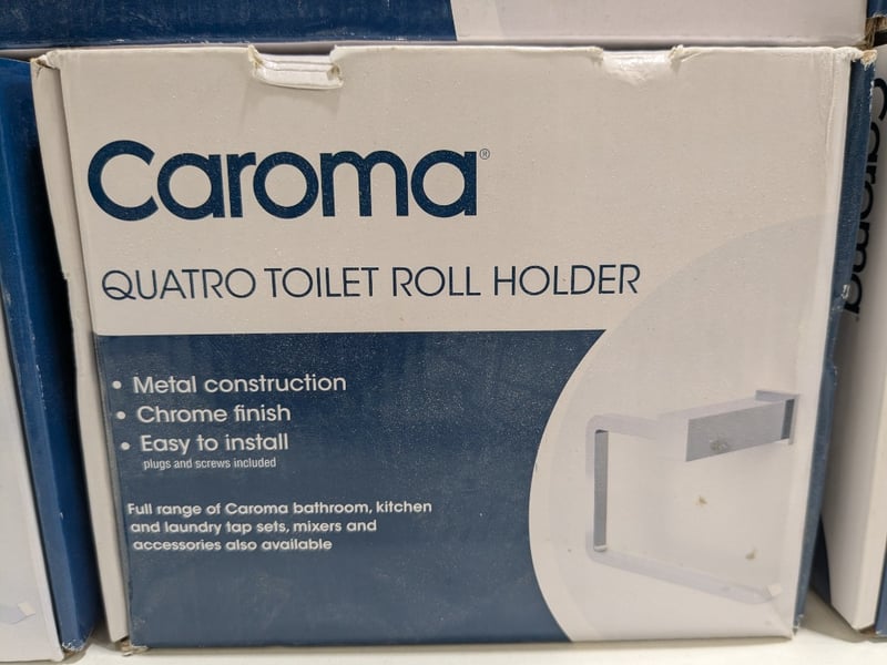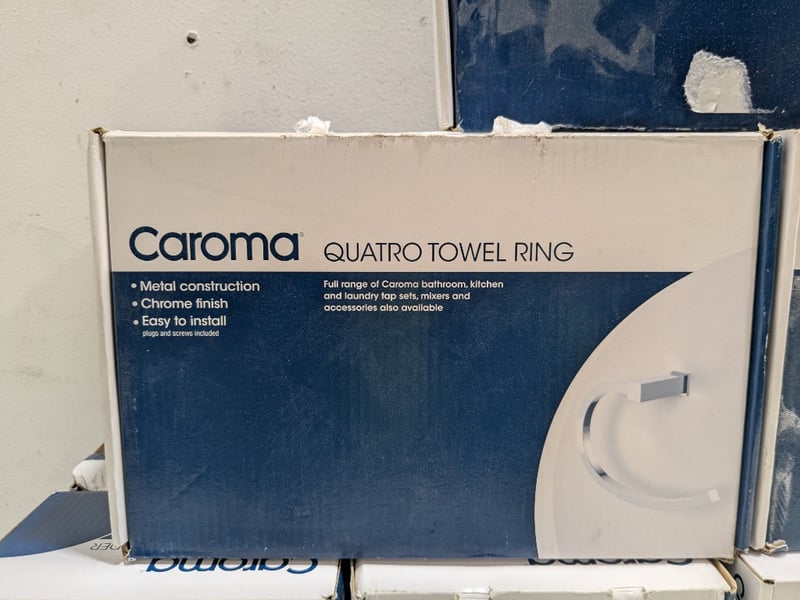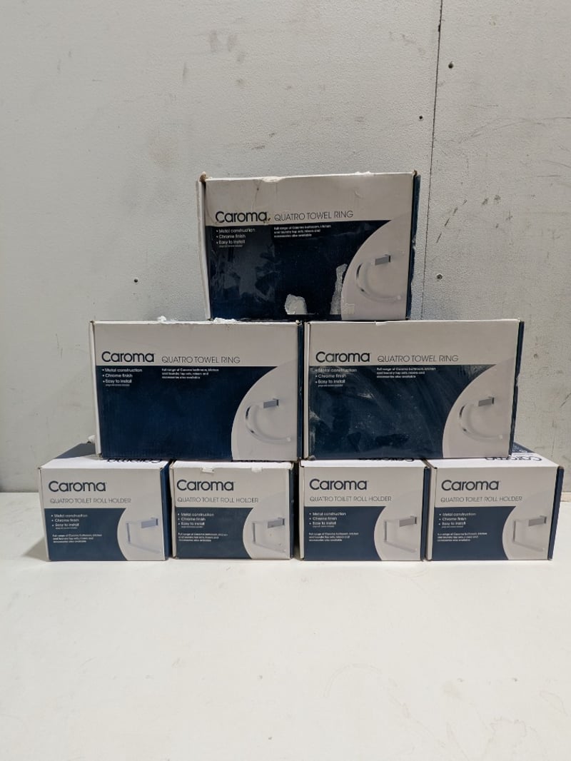 Collection of Caroma Quatro series bathroom accessories, including, towel ring, and toilet roll holders. Quantity to lot.Sold as a lot.Note: Signs of wear and tear, item untested, may have missing pieces.