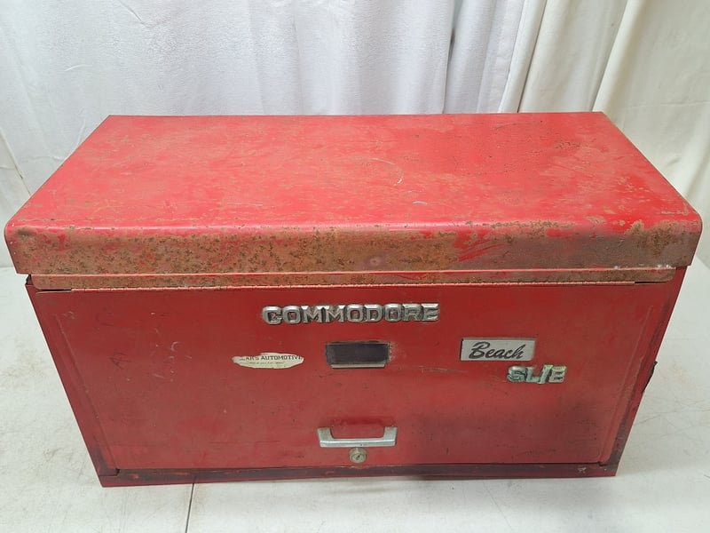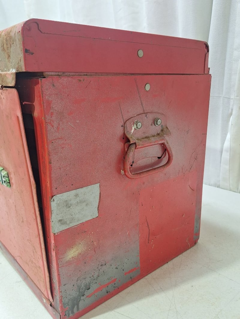 Tool Box, Metal Style, Red FinishPLEASE NOTE: Box Is Locked, Key Not IncludedDimensions H:39cm W:67cm D:32cm