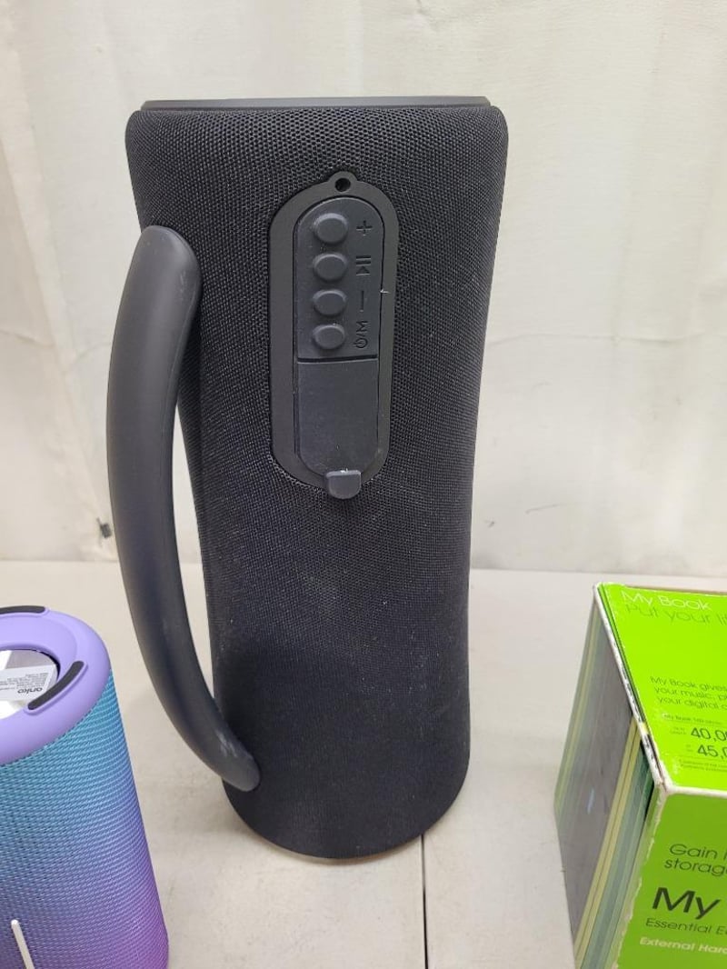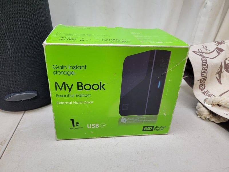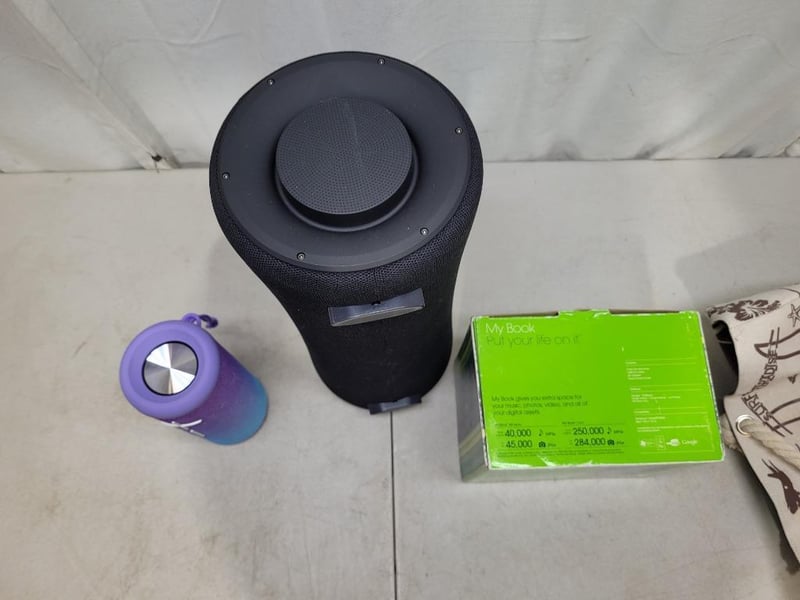1x Western Digital 1TB external drive, essential edition, model: WD10000H1U-00, in box and charger, 1x ANKO portable bluetooth speaker, model: 42976608, features IPX7 waterproof, comes with charging cable, 1x black cyclinder-shaped portable ultra bass bluetooth speaker
