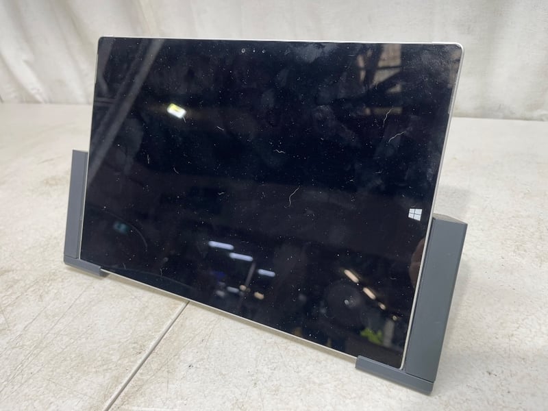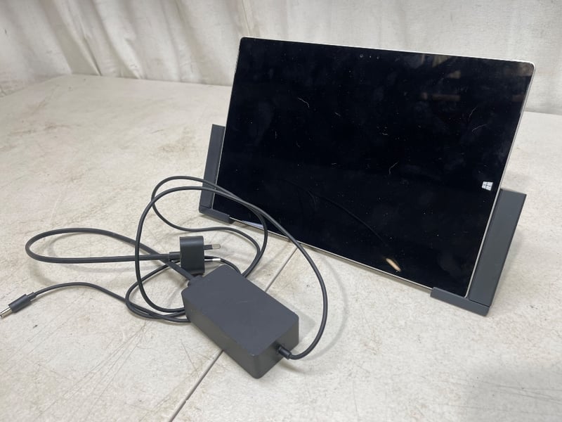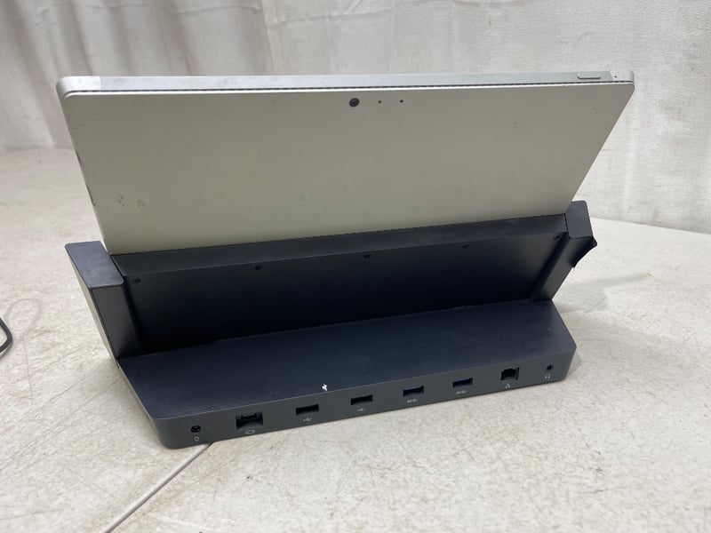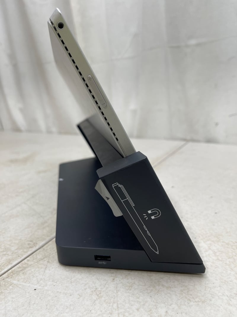 Microsoft Surface Tablet device in silver/grey finish with black docking station