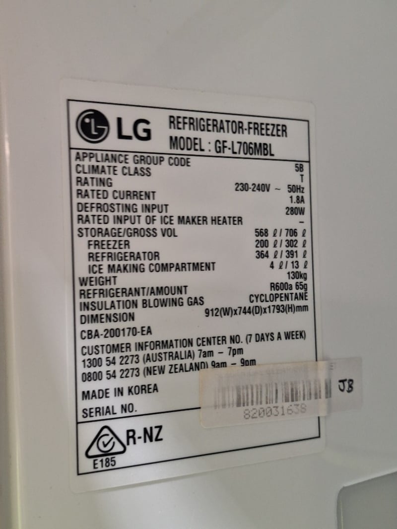 LG Refrigerator, Model GF-L706MBL Dimensions H:179cm W:91cm D:70cm DISCLAIMER: All of these fantastically presented products are sold as seconds, returns, scratch & dent stock or similar, as such Lloyds always recommends inspections on items prior to bidding, as some items may be displaying signs of minor faults, dents, wear, or scratches to products that may affect their intended use.