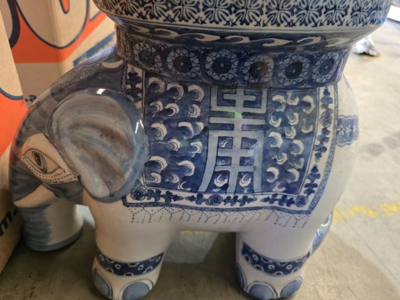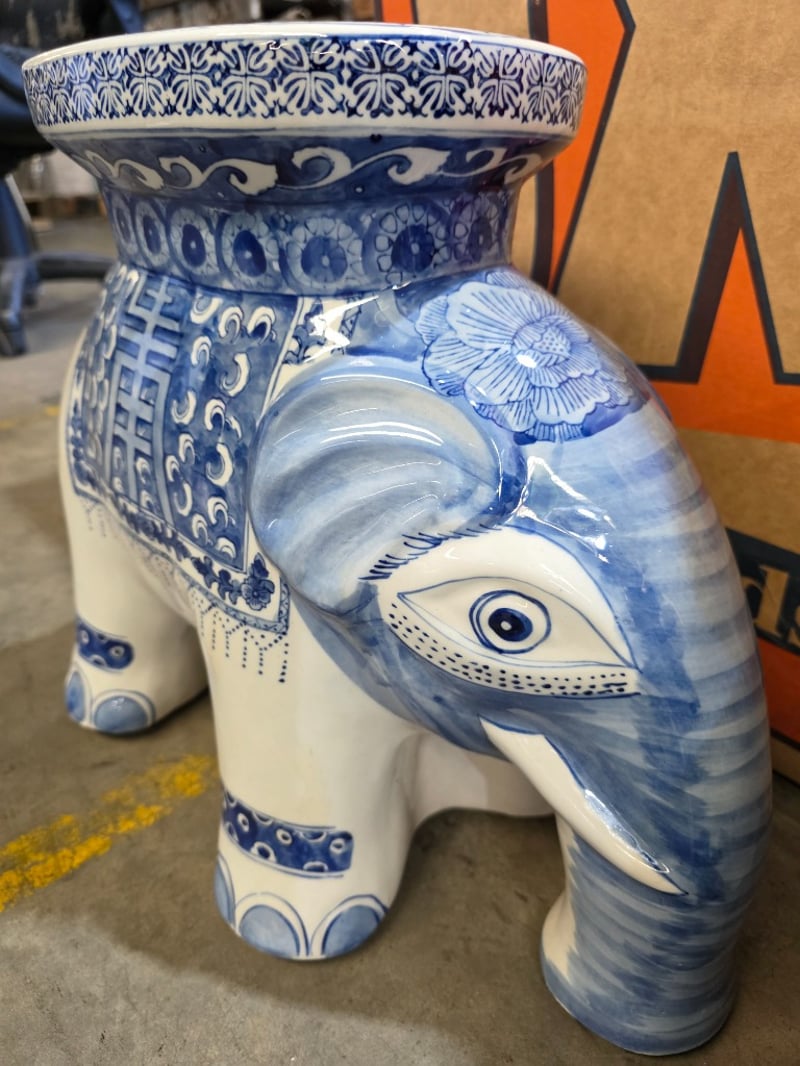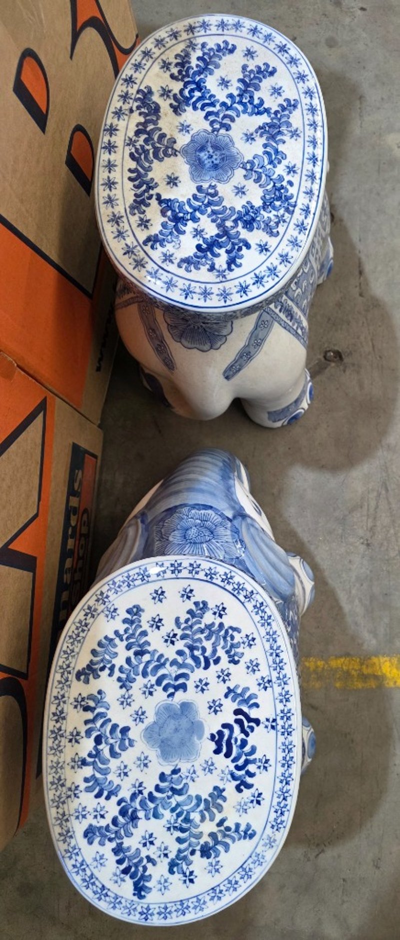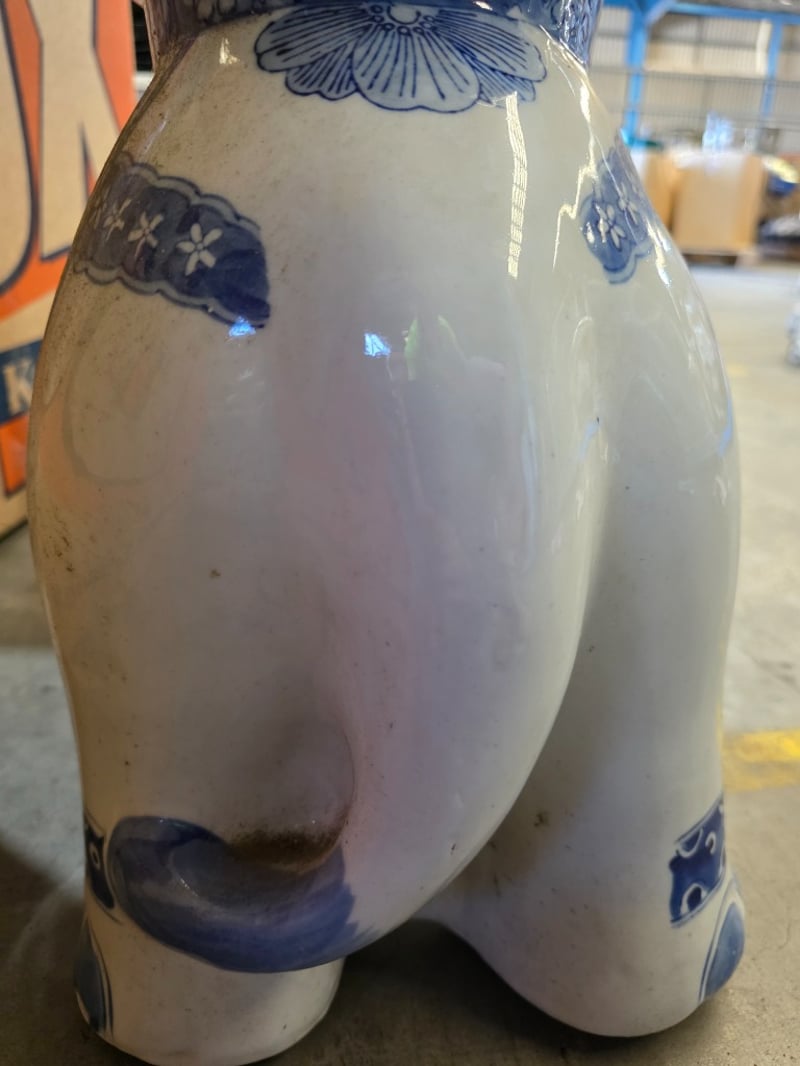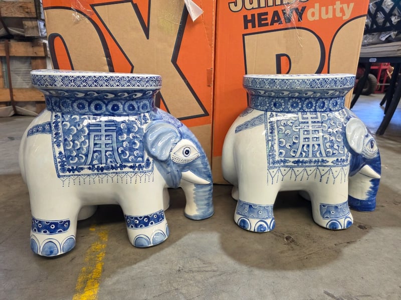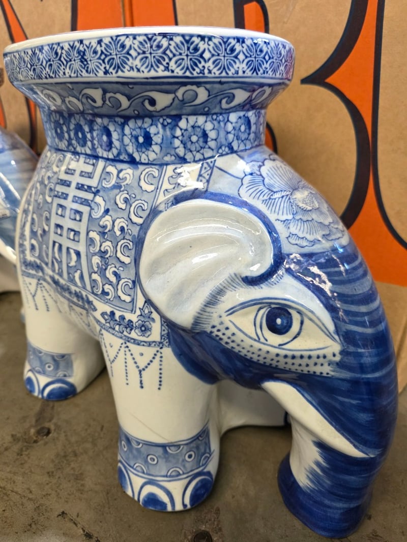 Two decrative ceramic elephants with a blue and white pattern design. Good condition. Dimensions: 25cm x 50cm