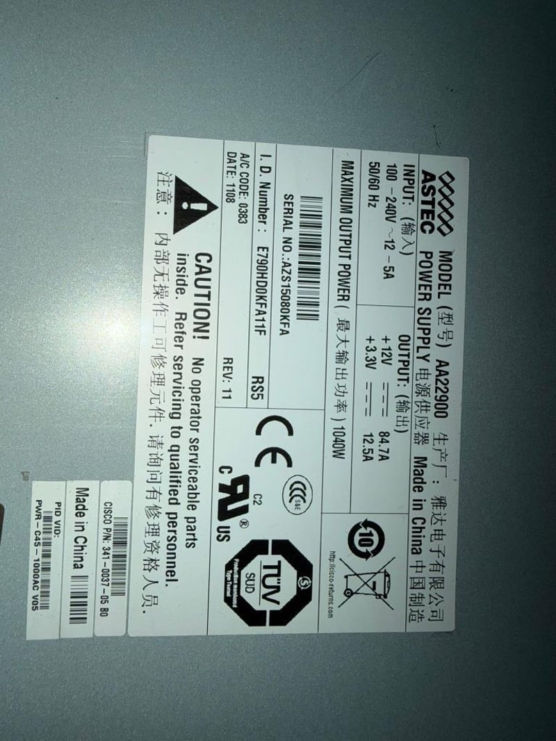 Astec AA22900 1040W Power Supply For Cisco Catalyst 4500 Series Switch Key Specifications and Features: Manufacturer: Astec Model/Part Numbers: AA22900, 341-0037-02, PWR-C45-1000AC Power Output: 1040 Watts Input Voltage: 100-240VAC, 12A-5A Frequency: 50-60Hz Compatibility: Cisco Catalyst 4500, 4503, 4507R series switches Features: Hot-pluggable (enables replacement without powering down the switch)