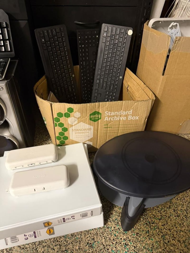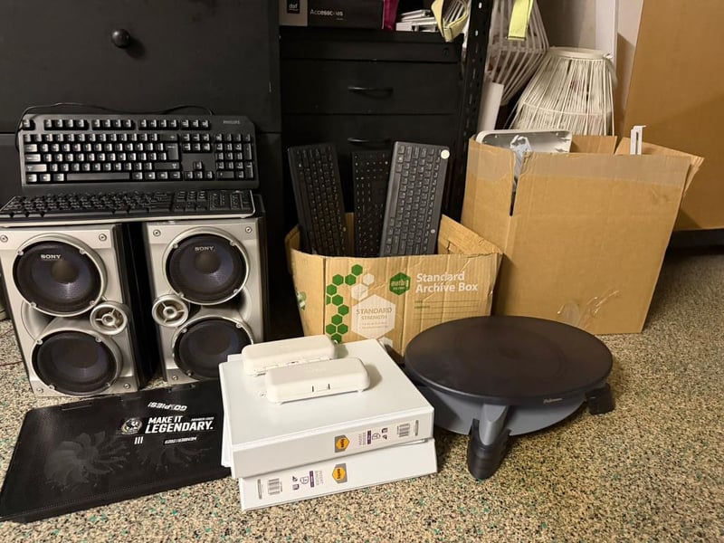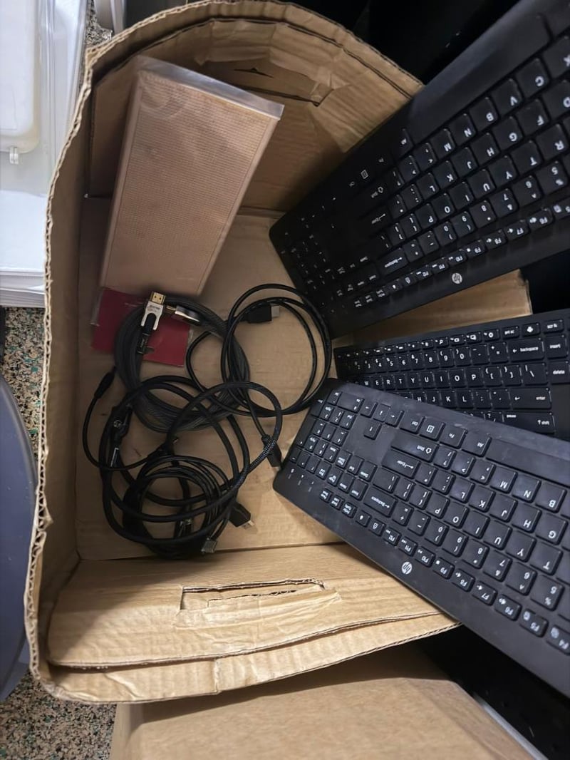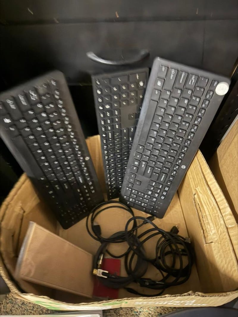 IT/Home Office LotMultiple Key Boards: Wired/WirelessHDMI Cable, Speaker, Fan Stand for Laptop to keep it coolFellowes Swivel Monitor Riser or Laptop stand adjustable heightPair of Epson Easy Interactive Pens -with magnetic caseBracket for the monitor hanging and many more. Selling as a lot.