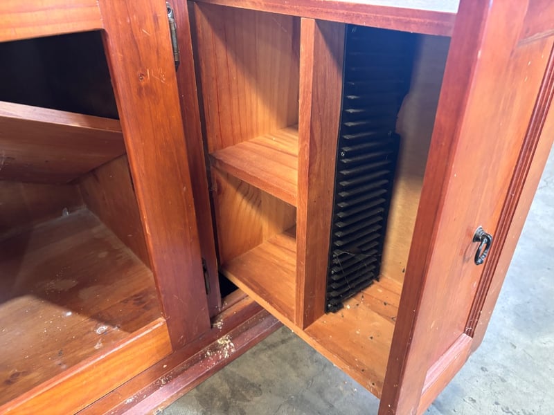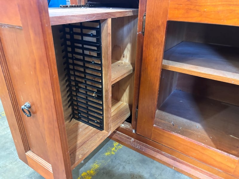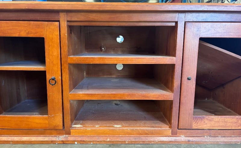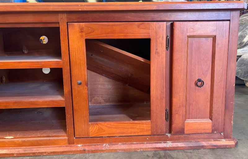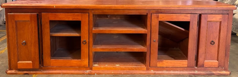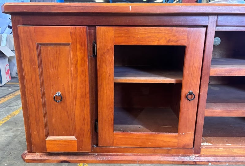 Wooden entertainment unit Note; scratches and scuffs, panels missing from cabinets, inspection recommended