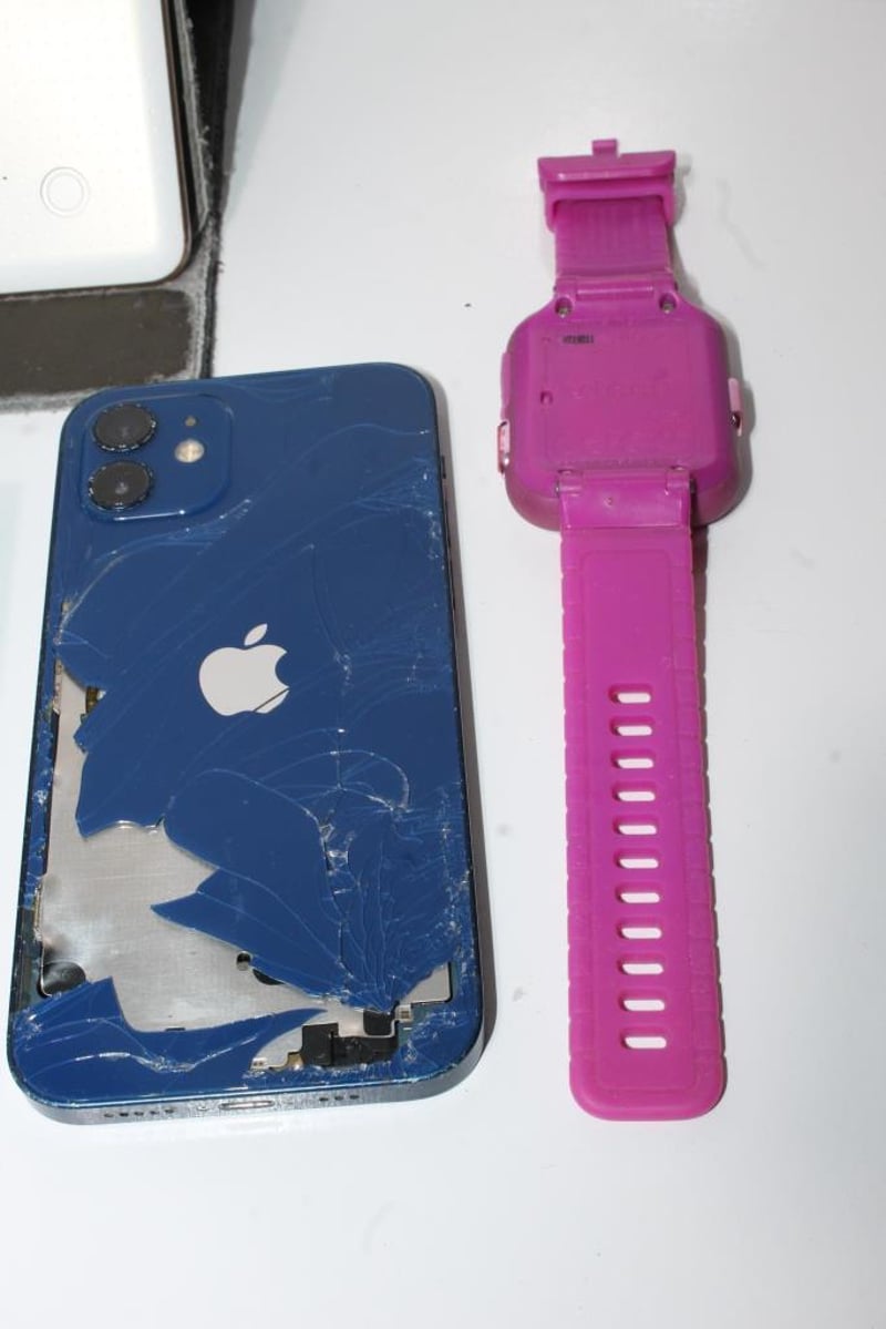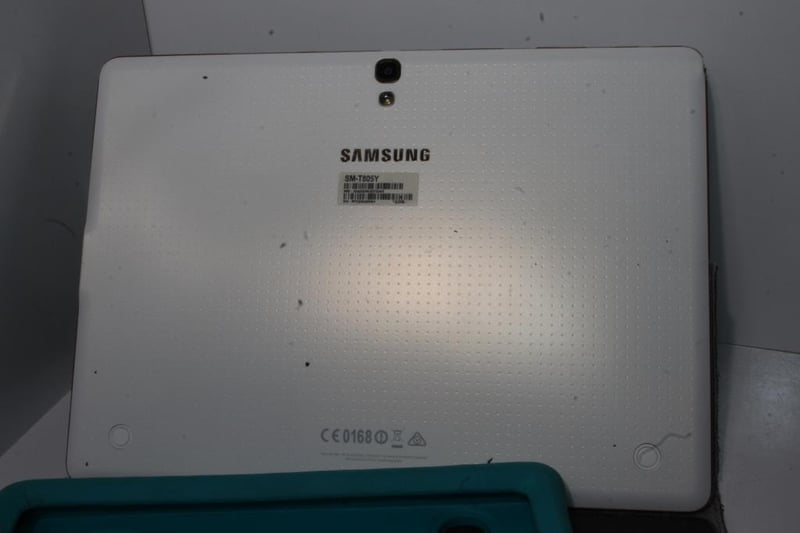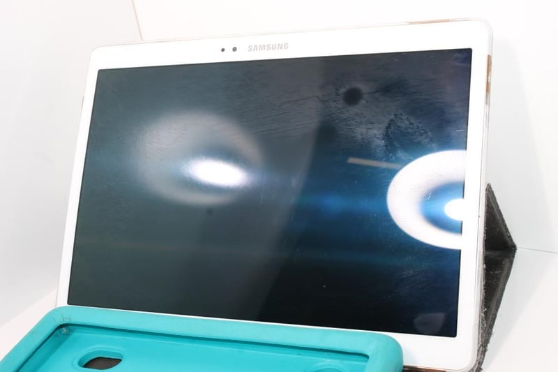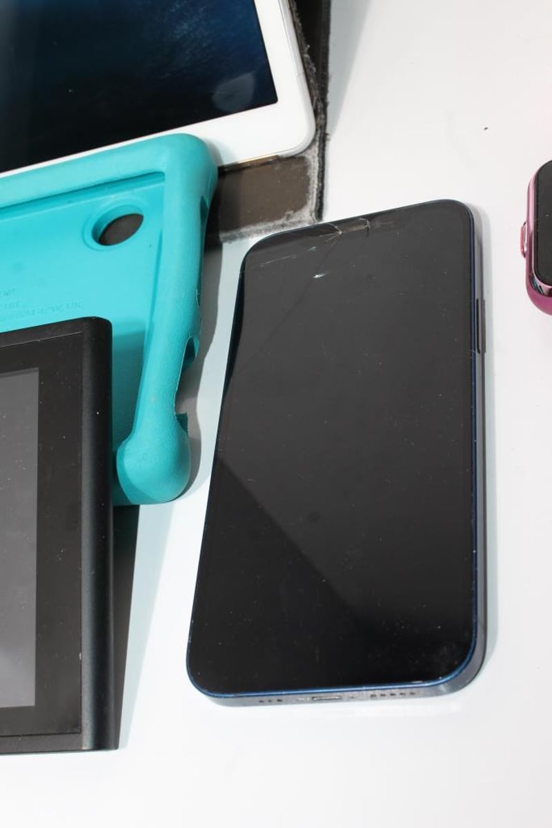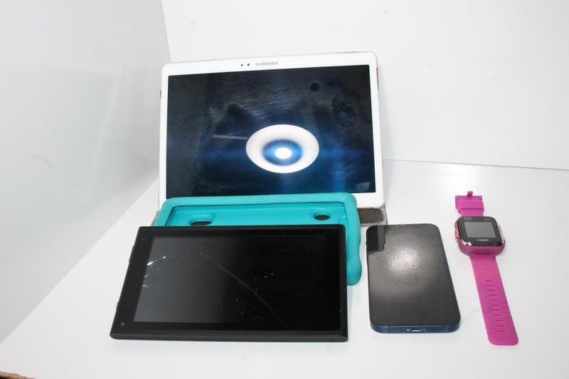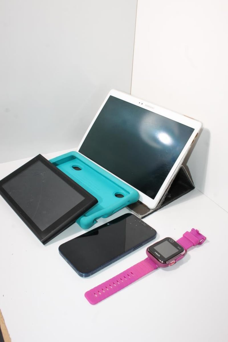 Samsung tablet (model visible SM-T805Y), Pebble Gear tablet, Apple iPhone with damaged rear glass, VTech kids smartwatch, plus tablet cases as shown.
