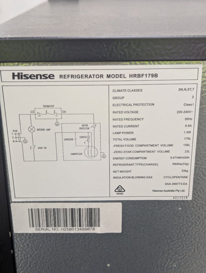 Fridge, Hisense, HRBF179B Dimensions: H 122.5cm x W 51.5cm x D 51cm