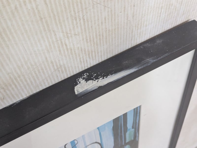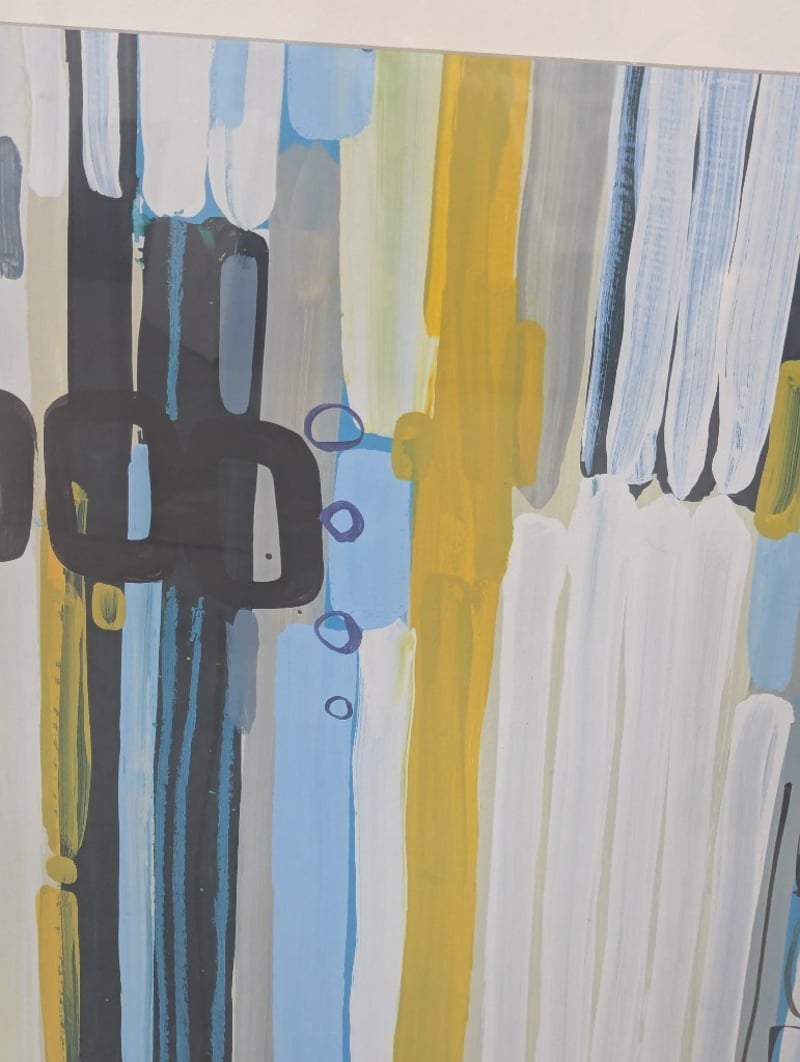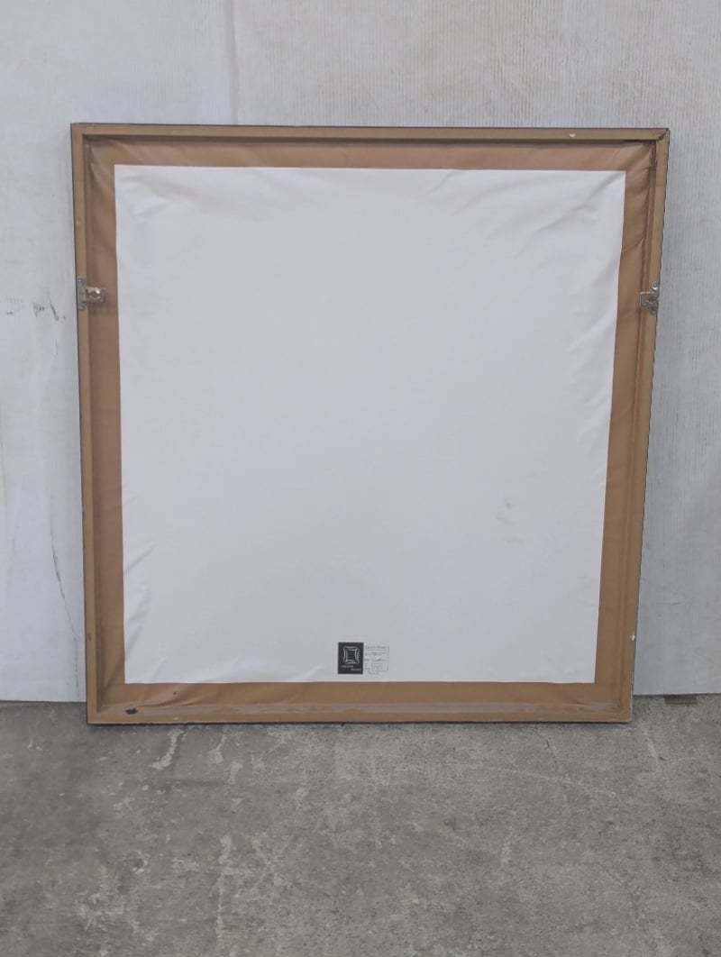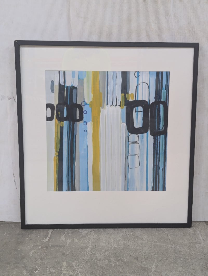 Framed print, blue and green colours Note: one corner of frame plus looseDimensions: H 83cm x W 78cm x D 4cm