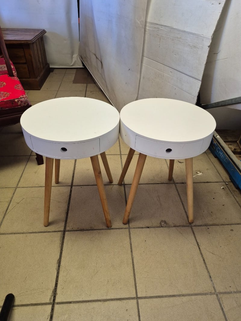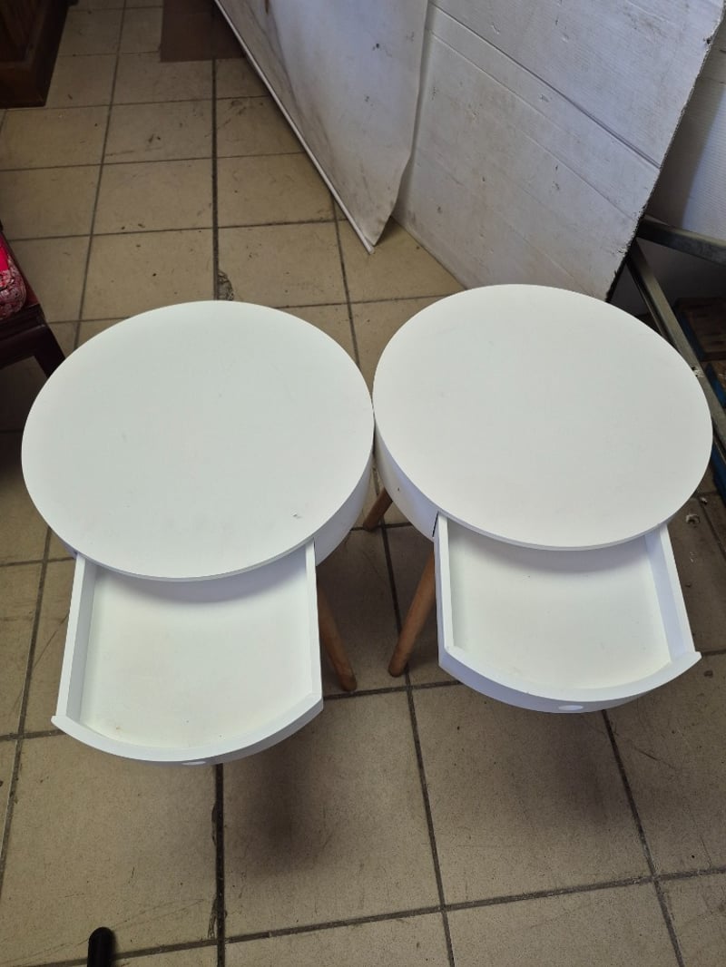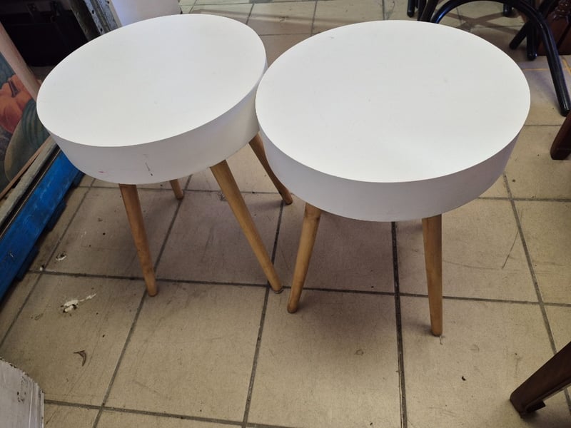 x2 round bedside tables, white tops Dimensions: H: 53cm W: 40cm D: 40cm SOLD AS LOT