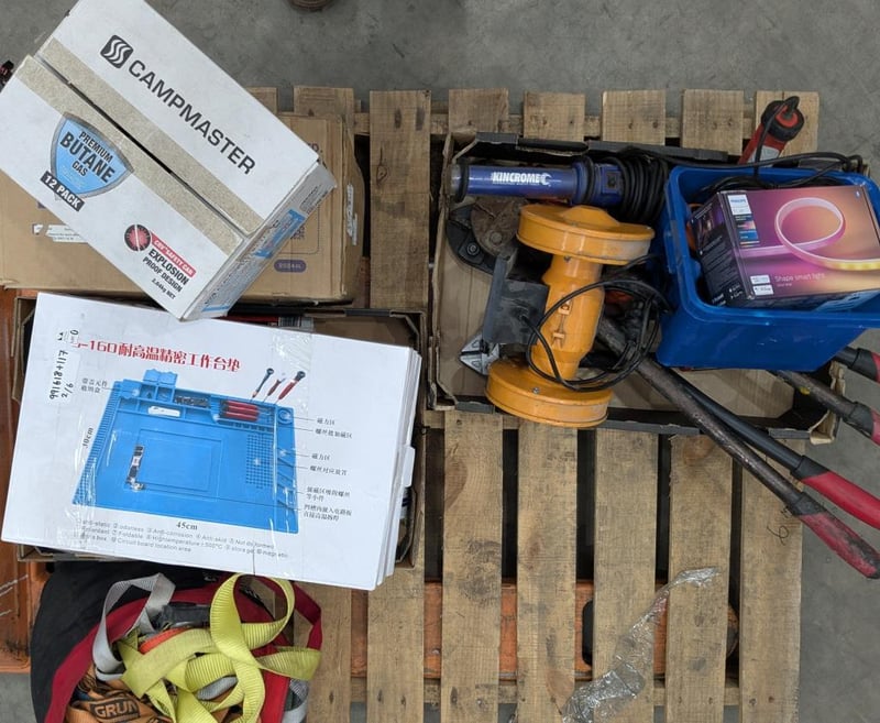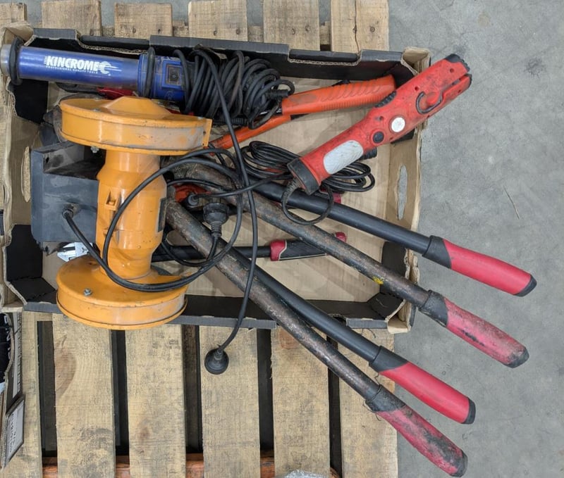 Assorted tools/ equipment, including; lights, bench grinder, ratchet straps, bolt cutters etc sold as lot