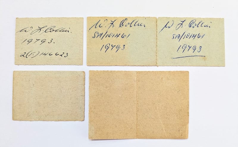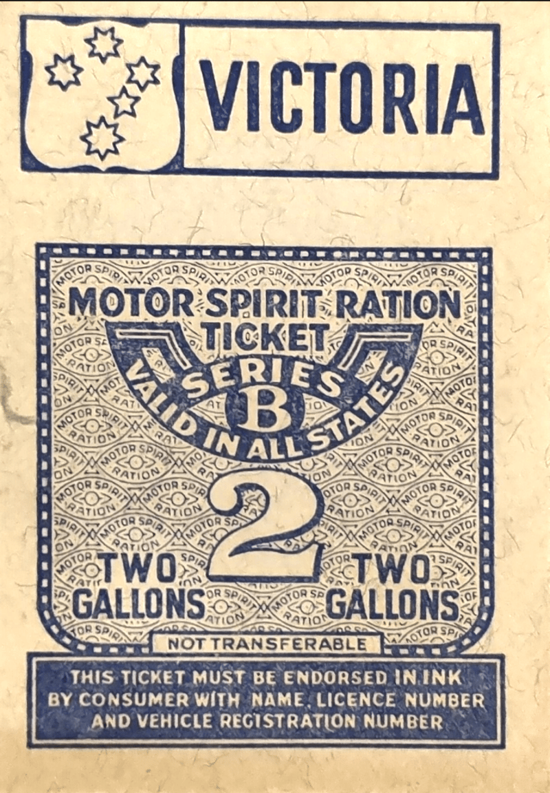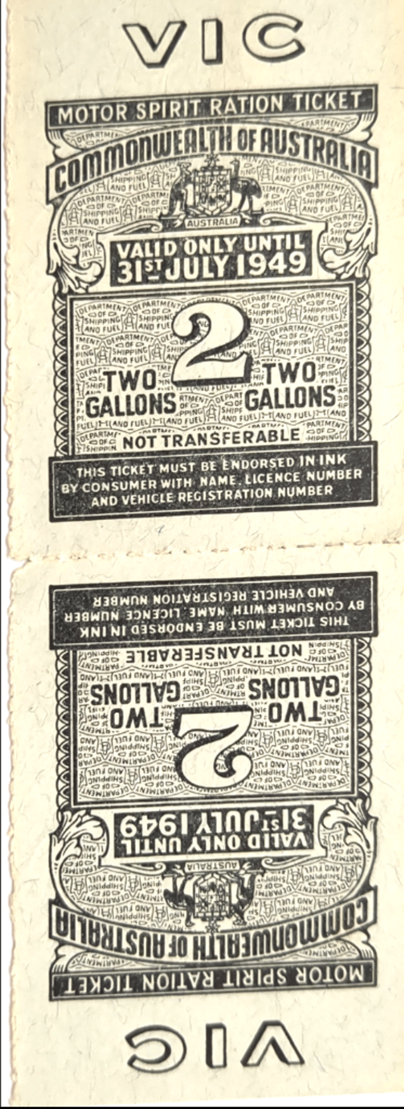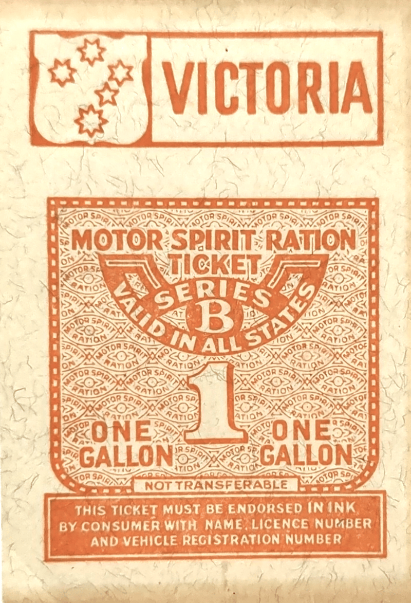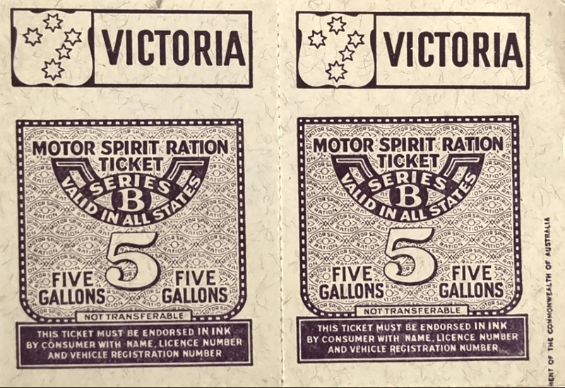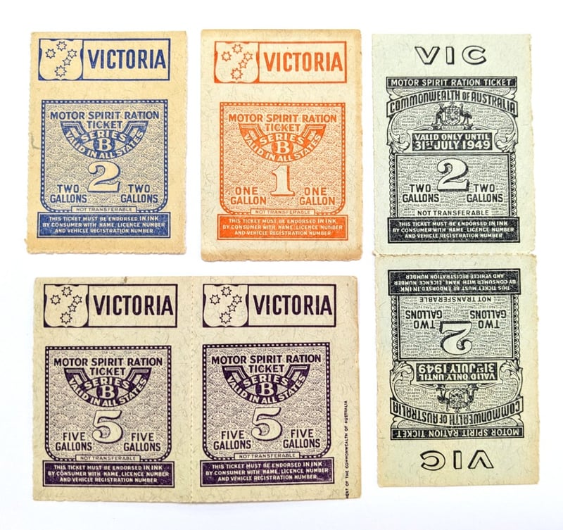 Victoria Motor Spirit Ration Ticket - Five Gallon (Brown) - Pair, Victoria Motor Spirit Ration Ticket - Two Gallon (Blue), Victoria Motor Spirit Ration Ticket - One Gallon (Orange), Vic Motor Spirit Ration Ticket, Commonwealth Of Australia - Two Gallon (Black) - Pair.