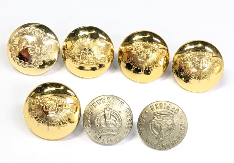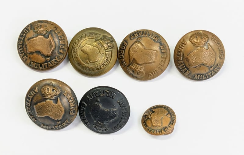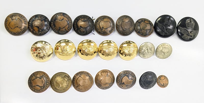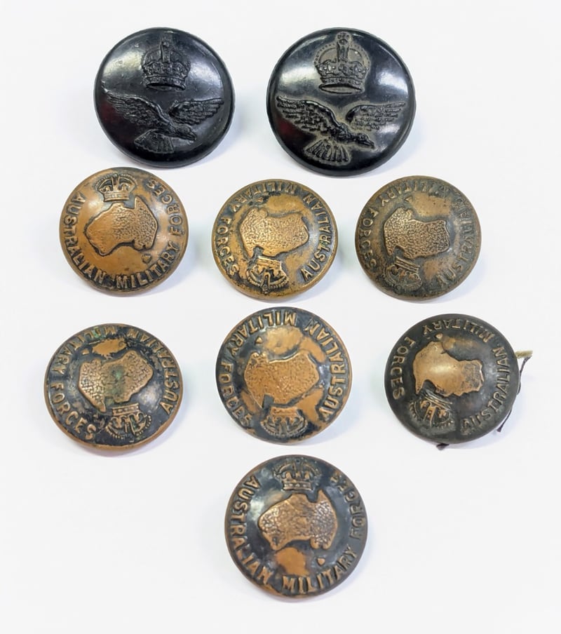 Australian Military Forces Brass Uniform Button 2Cm X 7, Australian Army Australian Federation Guard 2Cm X 4, Royal Australian Army Medical Corps 2Cm, Australian Military Forces Brass Uniform Button 1.7Cm 'Stokes & Sons', Royal Australian Air Force Ww2 Baklite 2 Sizes X 2, Austrailan Commonwealth Peace Officer 1.5Cm 'Stokes & Sons' X 2, Royal Australian Artillery, 1.5Cm 'Stokes & Sons', Australian Military Forces Brass Uniform Button 1.7Cm X 4, Australian Military Forces Brass Uniform B.