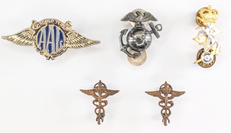 Australian Air League Forage Cap Badge, Usa Ww2 Usmc Officers Service Dress Collar Emblem, Ww2 Royal Air Force (Raf) Medical Branch Brass Collar Insignia, Royal Electrical & Mechanical Engineers (Reme) Cap Or Collar Badge.