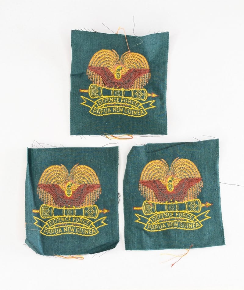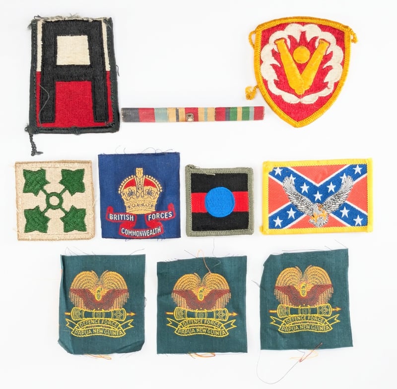 COLLECTION OF VINTAGE MILITARY PATCHES, INSIGNIA, AND RIBBONS, INCLUDING EXAMPLES FROM THE AUSTRALIAN ARMY AND PAPUA NEW GUINEA DEFENCE FORCE.