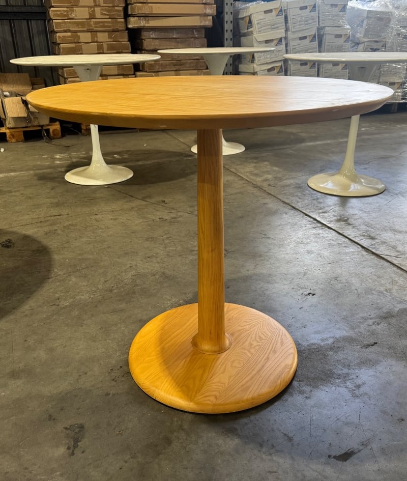 White round natural timber table, round baseDimensions: Diameter:80cm x 76 cm HNote: wear and tear