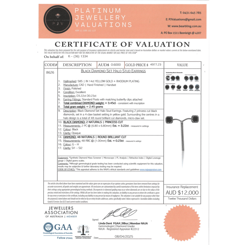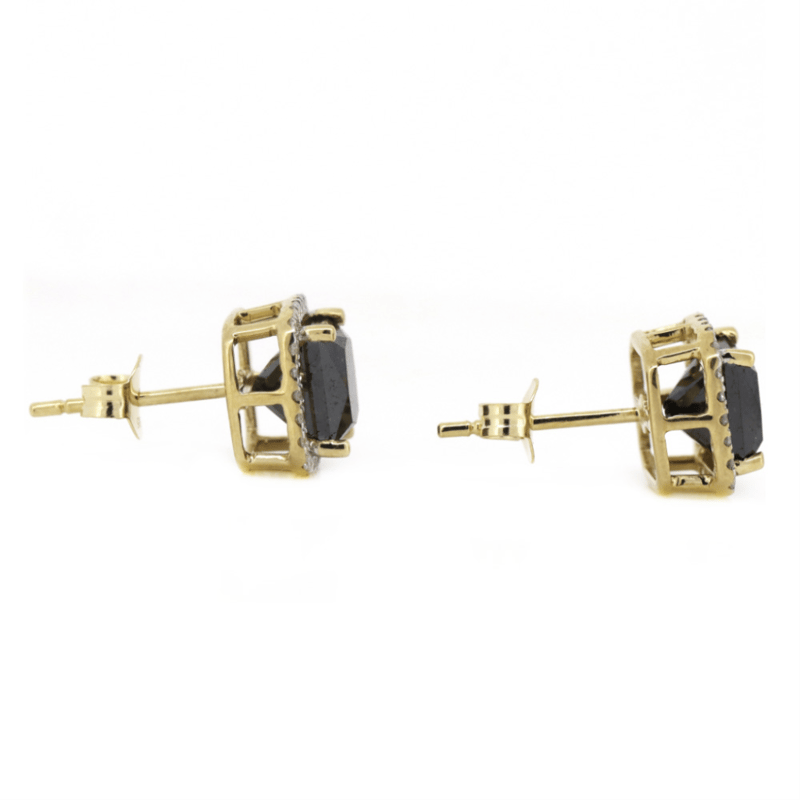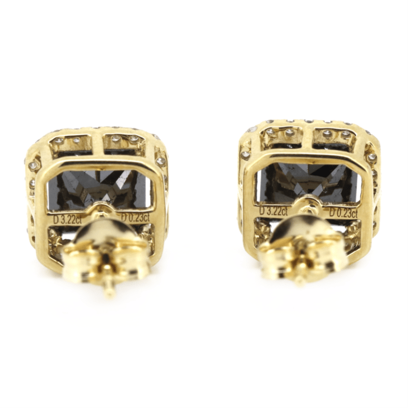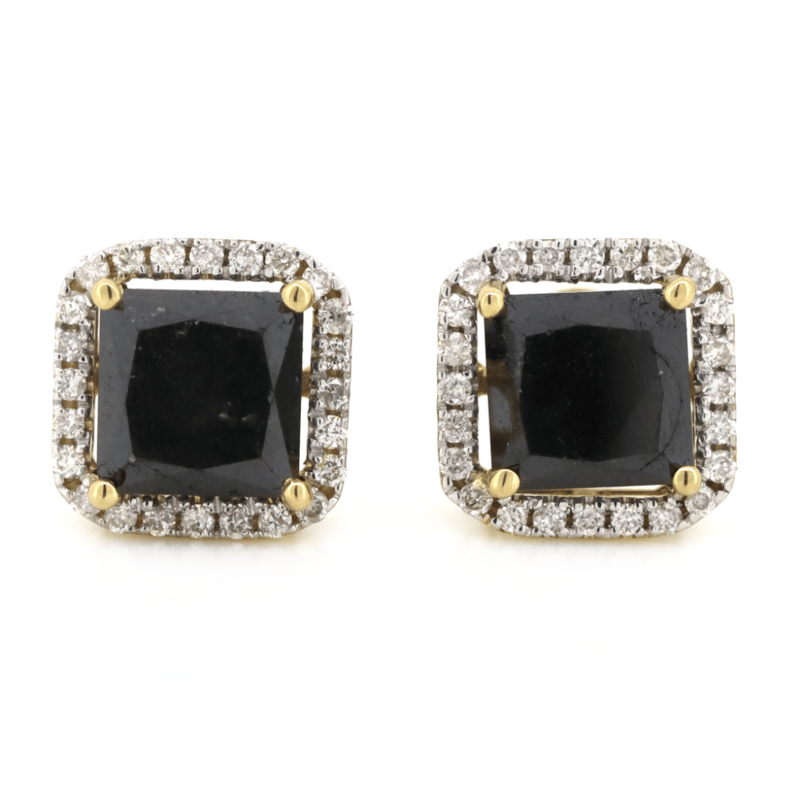 14K YELLOW GOLD, BLACK DIAMOND AND DIAMOND, HALO STUD EARRINGS. The Centres Feature, 2 Princess Cut, Black, Diamond (3.22Ct Tsw, Opaque), 4 Claw Set In Yellow Gold. Surrounding The Centres In Halos Are, 48 Round Brilliant Cut, Diamonds (0.23Ct Tdw, G-H Colour, Si1-Si2 Clarity), Micro-Claw Set. The Earrings Have Post Backs, With 14K Yellow Gold Butterfly Clasps. Valuations Provided by an Independent Third-Party Professional Not Directly Associated With Lloyds Auctions at AUD $$12,000.00This valuation has been conducted by an independent third-party professional. The valuation amount is an assessment by the issuing valuer and does not reflect the auction value of the item. Any inquiries regarding the valuation should be directed to the issuing valuer (refer to contact details on the certificate), as Lloyds Auctions has no affiliation or influence over the valuation, the valuer, or the stated amount. Condition: Good - Refer Images 0645947+13