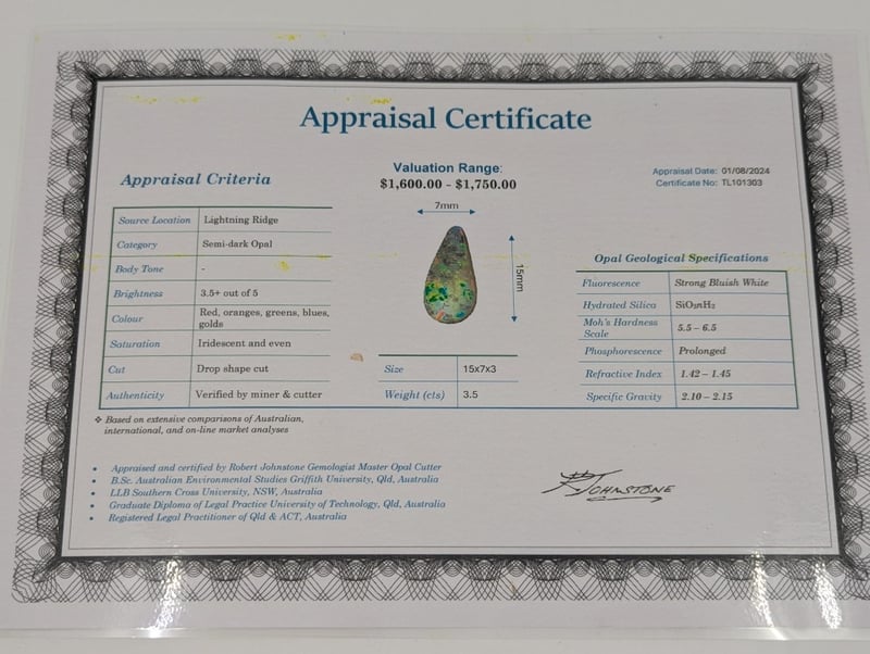 3.5CT LIGHTNING RIDGE CRYSTAL OPALStrong Bluish White, Red, Oranges, Green & Golds, Brightness 3.5+ Out Of 5Dimensions: Height: 15.00mm, Width: 7.00mm, Depth: 3.00mmThis valuation has been conducted by an independent third-party professional. The valuation amount is an assessment by the issuing valuer and does not reflect the auction value of the item.Any inquiries regarding the valuation should be directed to the issuing valuer (refer to contact details on the certificate), as Lloyds Auctions has no affiliation or influence over the valuation, the valuer, or the stated amount.Insurance Replacement Valuation Amount: $1,600.00VAULT587871+2