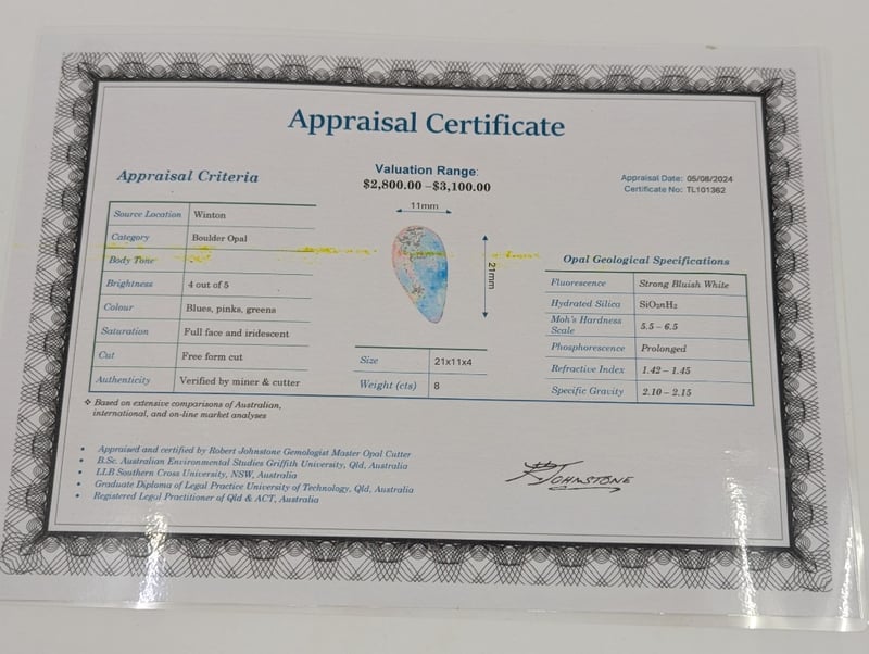 8CT WINTON BOULDER OPALBrightness 4 Out Of 5, Colours: Blues, Pinks, Greens, Full Face And Iridescent, Double Sided StoneDimensions: Height: 21.00mm, Width: 11.00mm, Depth: 4.00mmCondition: Good - Refer To ImagesThis valuation has been conducted by an independent third-party professional. The valuation amount is an assessment by the issuing valuer and does not reflect the auction value of the item.Any inquiries regarding the valuation should be directed to the issuing valuer (refer to contact details on the certificate), as Lloyds Auctions has no affiliation or influence over the valuation, the valuer, or the stated amount.Insurance Replacement Valuation Amount: $2,800.00VAULT587871+3