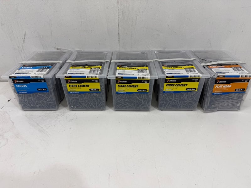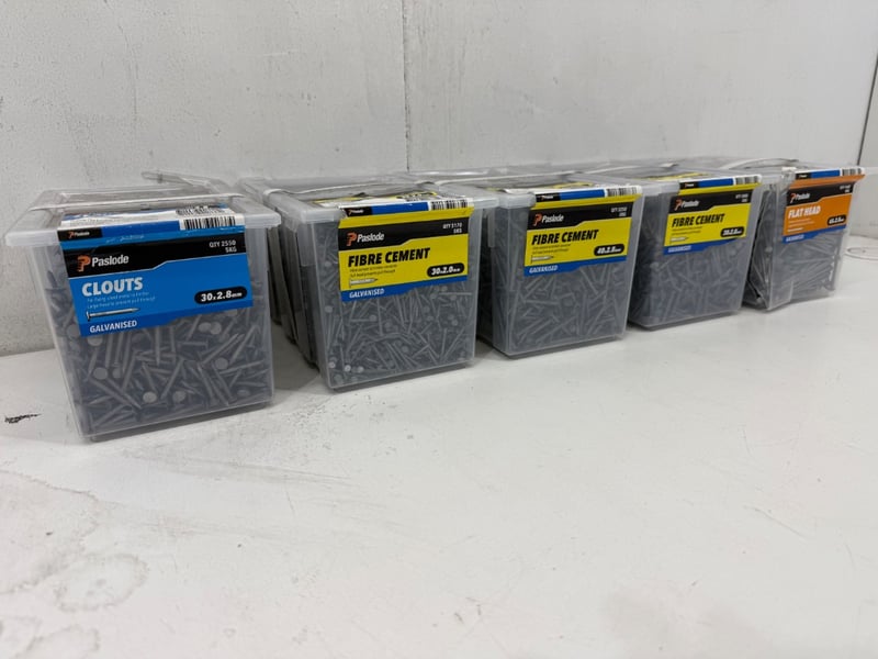 Nails, Paslode, Assorted types including Clouts 30x2.8mm, Fibre Cement 30x2.0mm, 40x 2.8mm, 30x2.8mm and Flat head 65x2.8mm. Quantity-5 boxes, sold as lot.