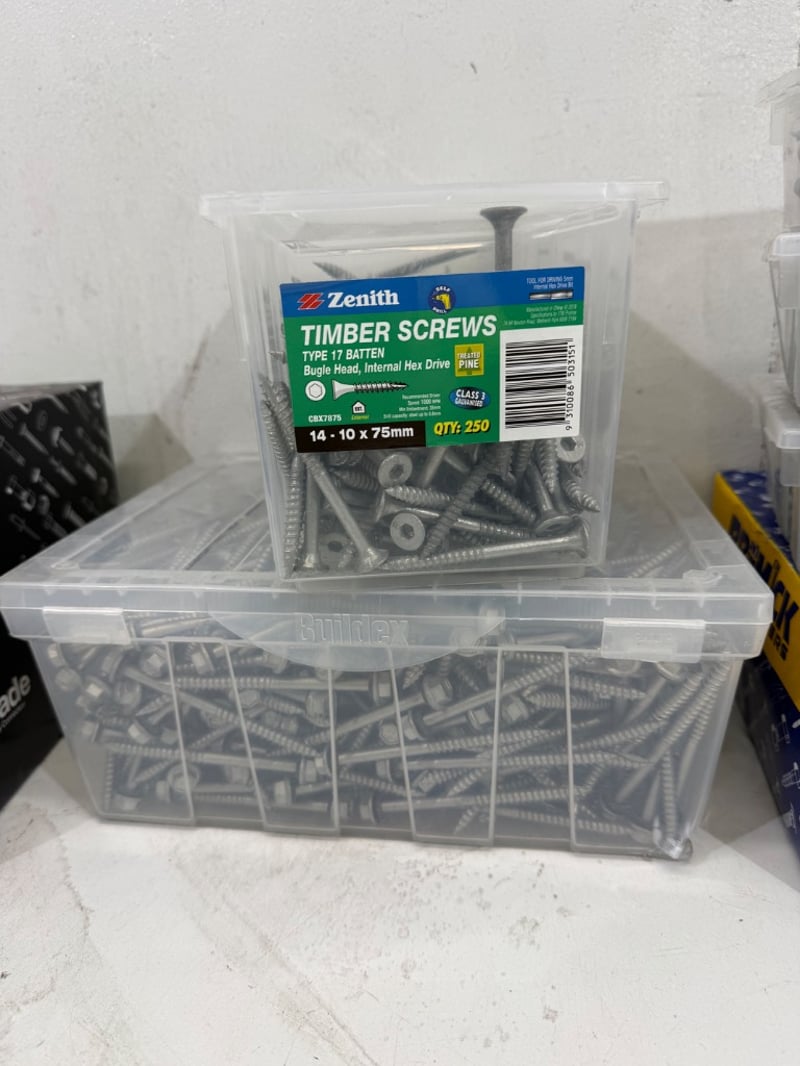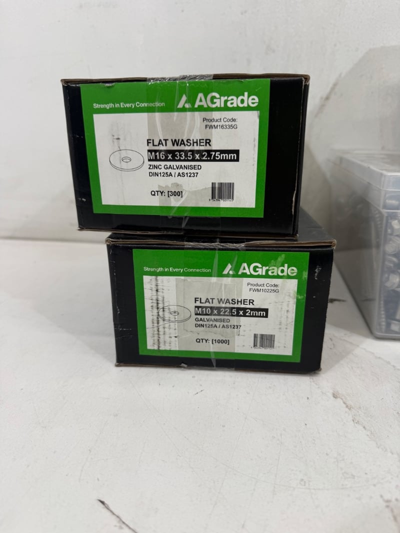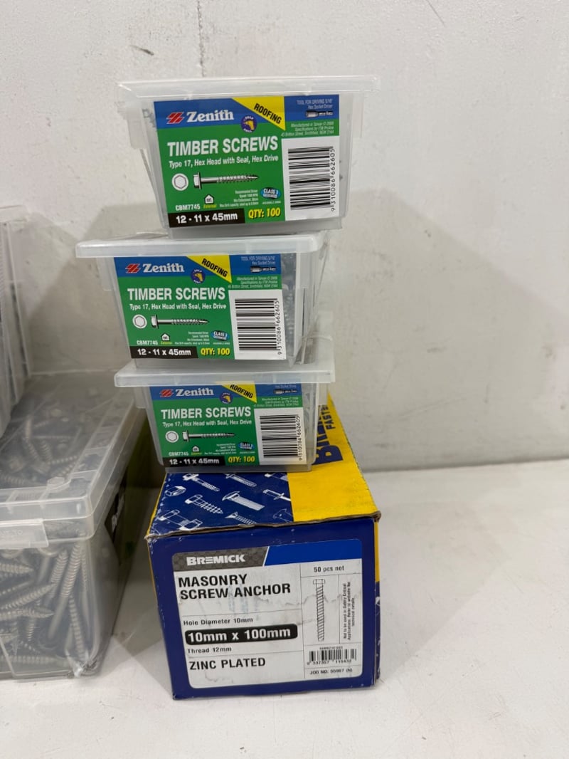Screws/ Washers, brands include AGrade, Zenith, Bremick and Buildex, Assorted types/ Sizes including Flat Washers M16x 33.5 x 2.75mm, Timber Screws 14-10 x 75mm, 12-11 x 45mm, Masonry Screw Anchor 10x 100mm. Quantity- 8 boxes, sold as lot.