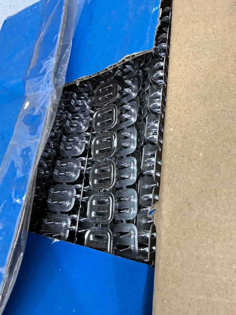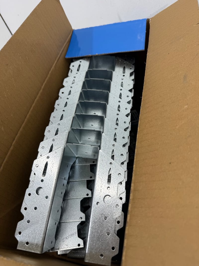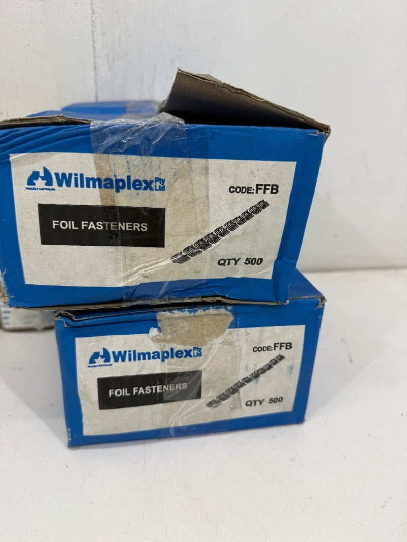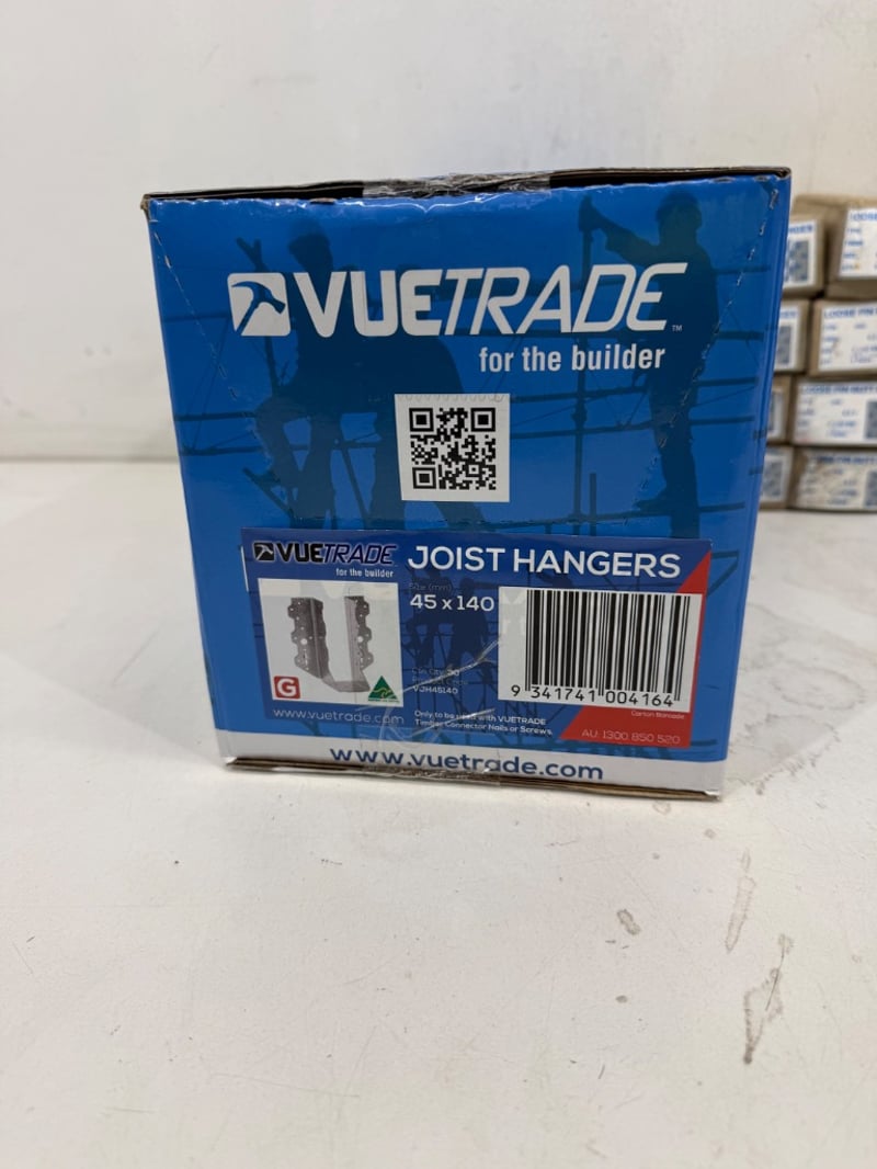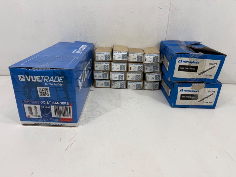 Joist Hangers/ Hinges/ Foil Fasteners, Assorted Beands including Vuetrade and Wilmaplex, Items include Joist Hangers 45x140mm, Loose Pin Butt Hinges 100x 71mm, Foil Fasteners. Quantity- 19 boxes, sold as lot.