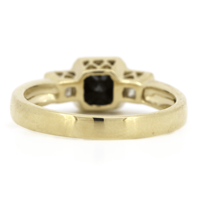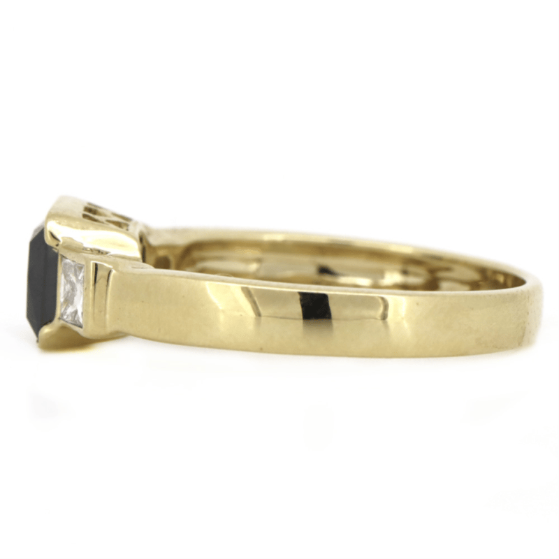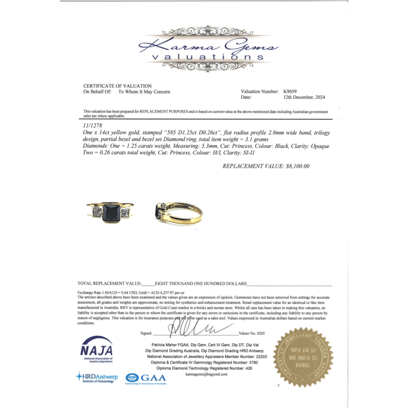 The Centre Features, One Princess Cut, Black, Diamond (1.25Ct, Opaque), Bezel Set. Flanked By, 2 Princess Cut, Diamonds (0.26Ct Tdw, H-I Colour, Si-I1 Clarity), Bezel Set. Ring Size N.