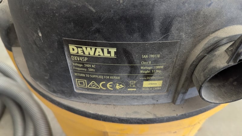 Industrial Vacuum, DeWalt, Model: DXV45P, 1300W, 240V, With Hose and Vacuum Head,