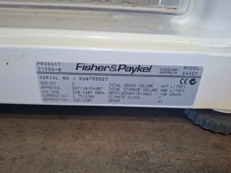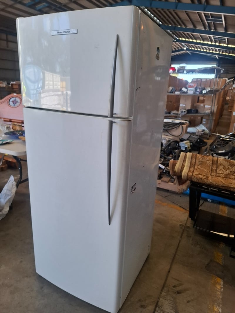 Fridge Make: Fisher & PakelModel: E440TSerial: EUQ795027Dimensions: 68 cm ( W) x 65cm ( D) x 170 cm ( H)Description/extras: white color, gross volume 447 L, storage volume 403L , freezer, fridge, scuff and marks, cleaning required, working condition unknown