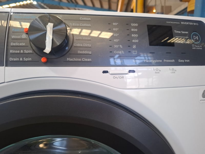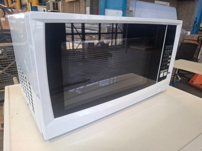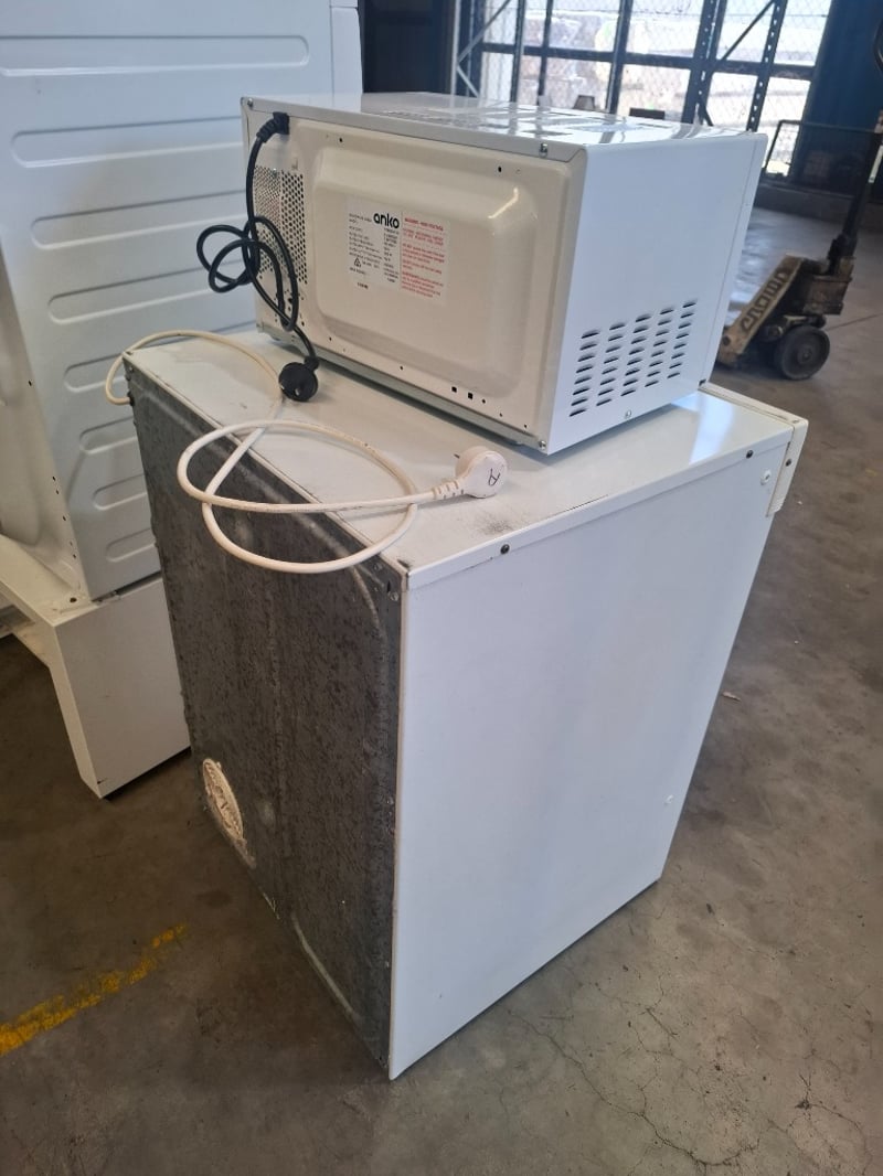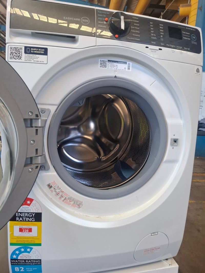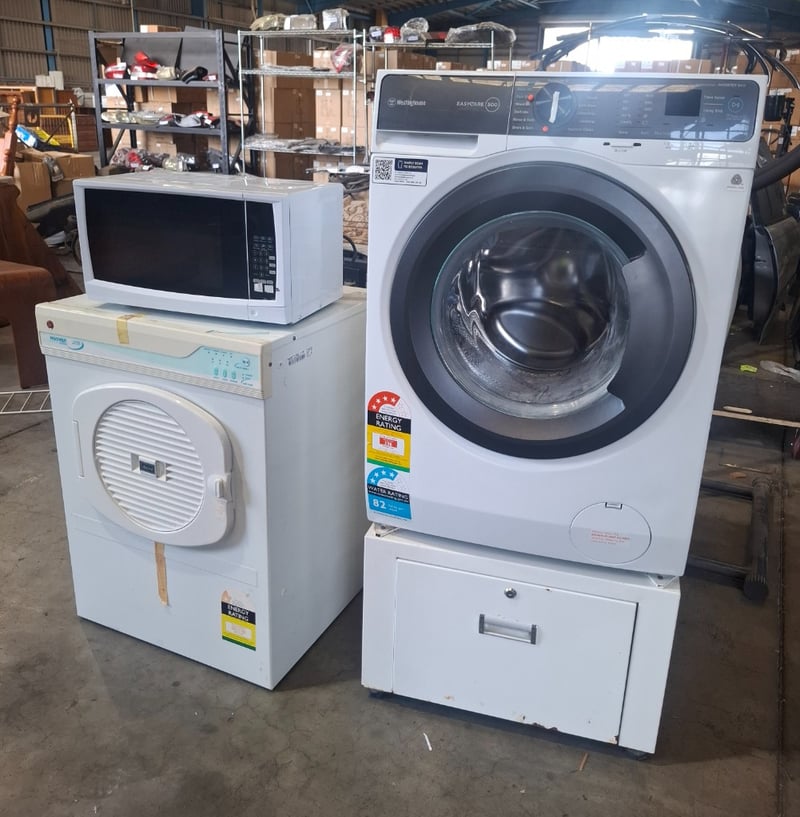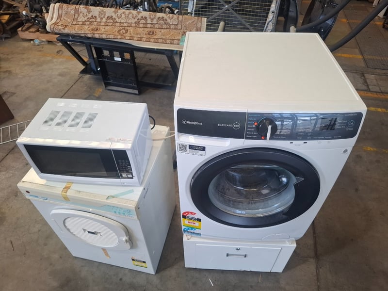 Assortment of white go0ds appliances includes 1 x 9 kg Westinghouse front load washing machine model easy-care 500, 1 x 5kg Hoover auto dry plus 5050ED Dryer, 1 x Anko microwave, 1 x washing machine stand metal cabinet white
