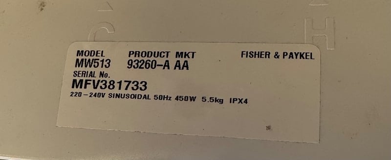 Make: fisher & paykelModel: MW513 93260-A AASerial: MFV381733Dimensions: 56cm x 56cm x 102cmDescriptions/extra: inspection recommended, cleaning required, working condition unknown