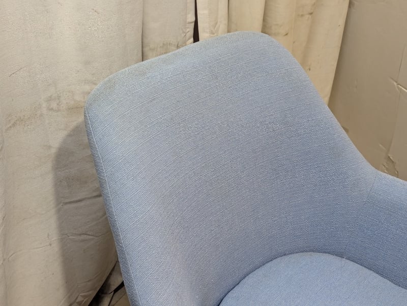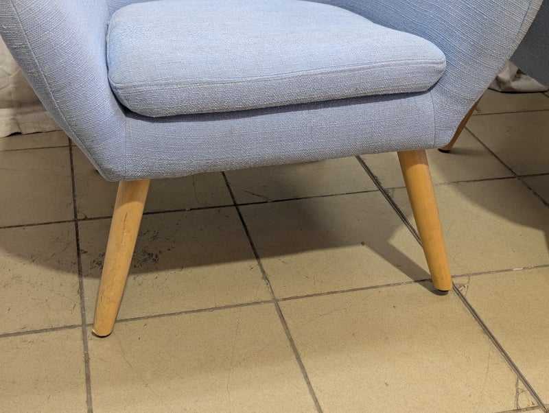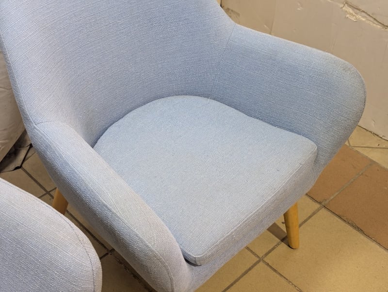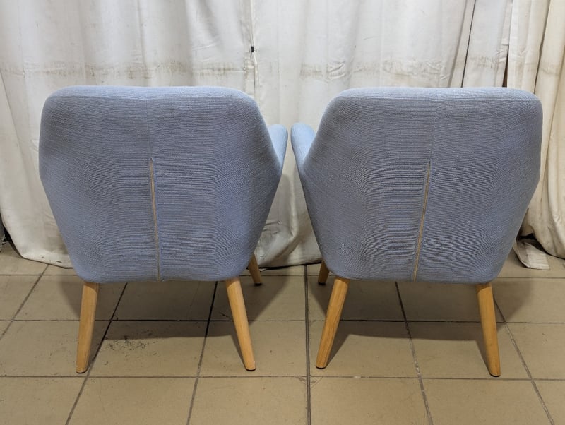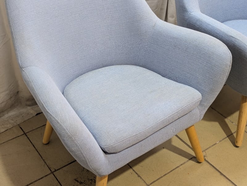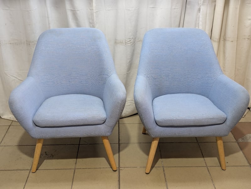 Two lounge chairs, blue fabric upholstery, four timber legs, chair size: 85cm h x 75cm W x 68cm D