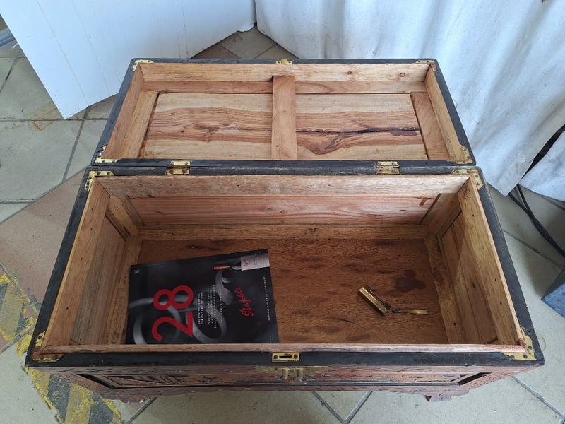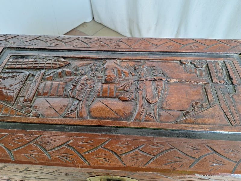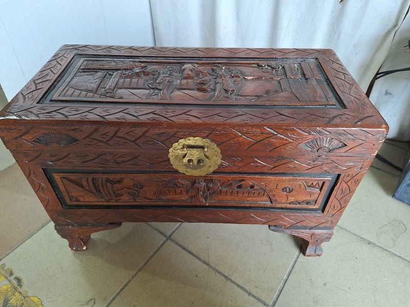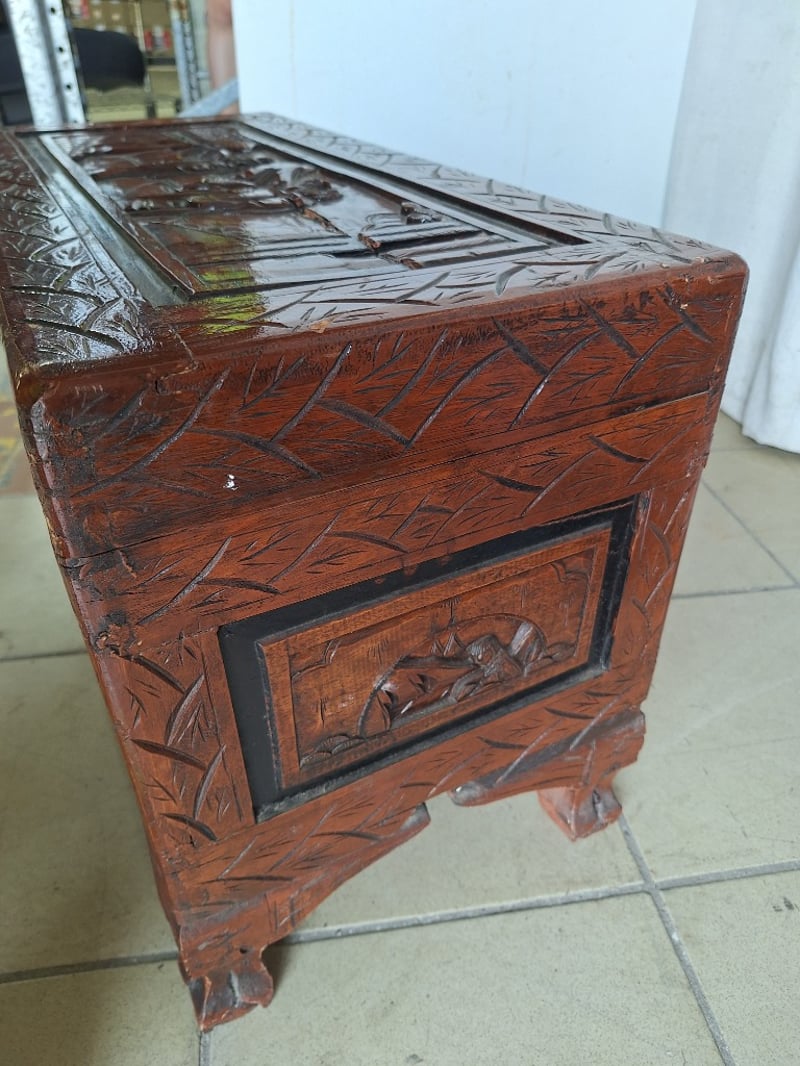 Hand Craved Chest, Timber Style, Brown FinishDimensions H:43cm W:67cm D:32cm