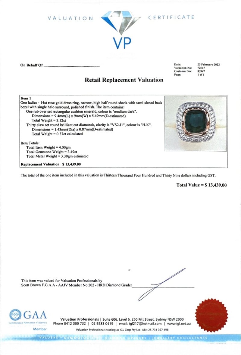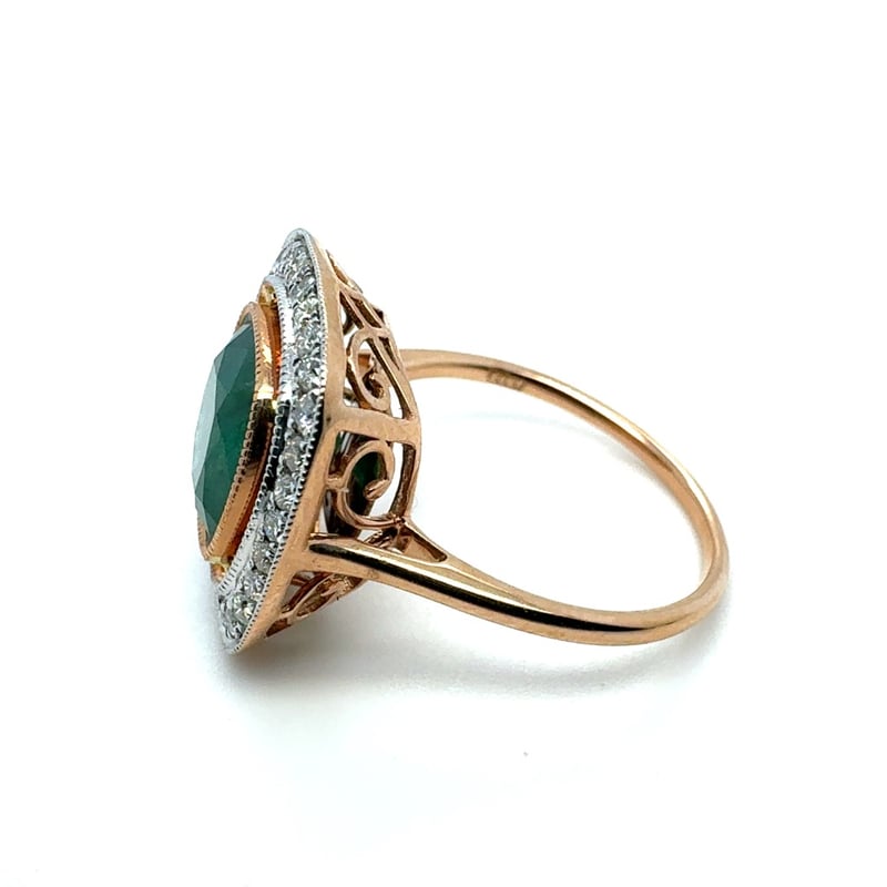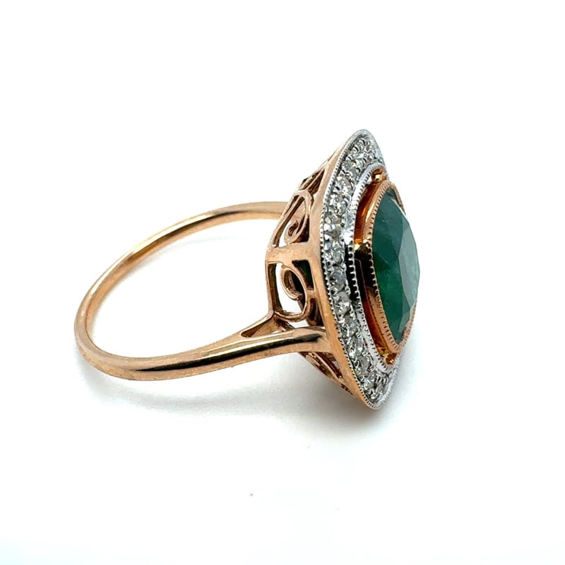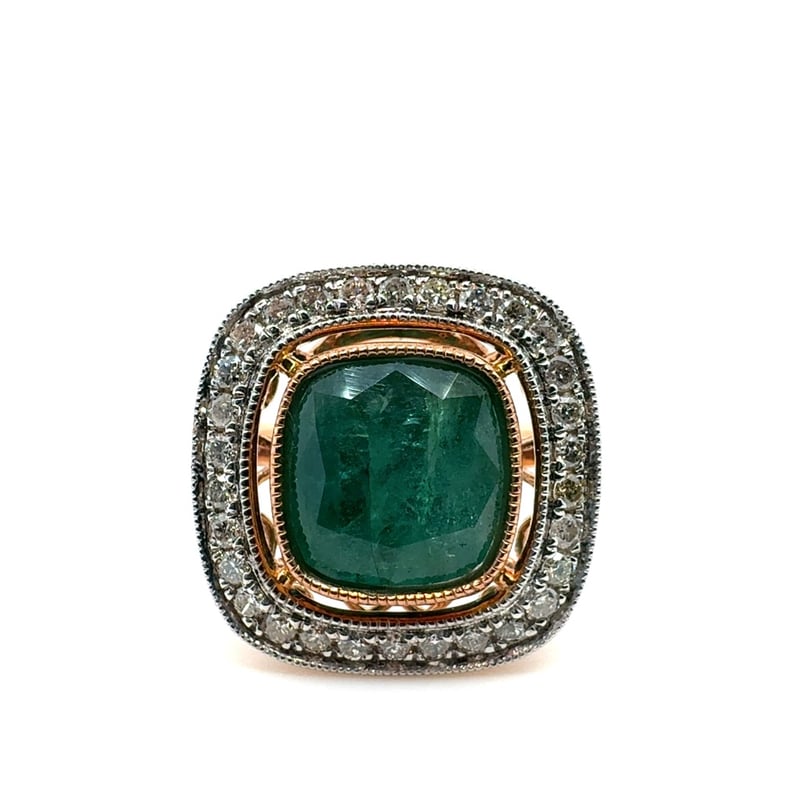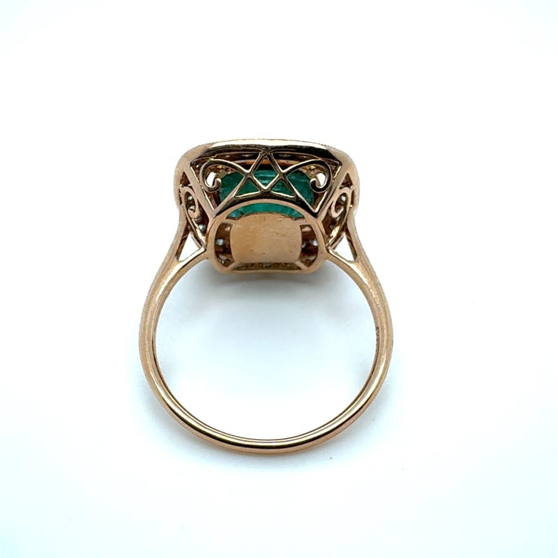 14CT ROSE GOLD CUSHION CUT EMERALD AND DIAMOND RING