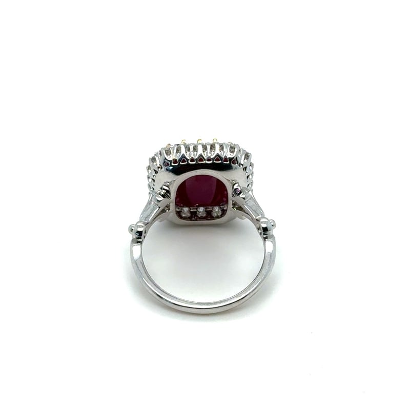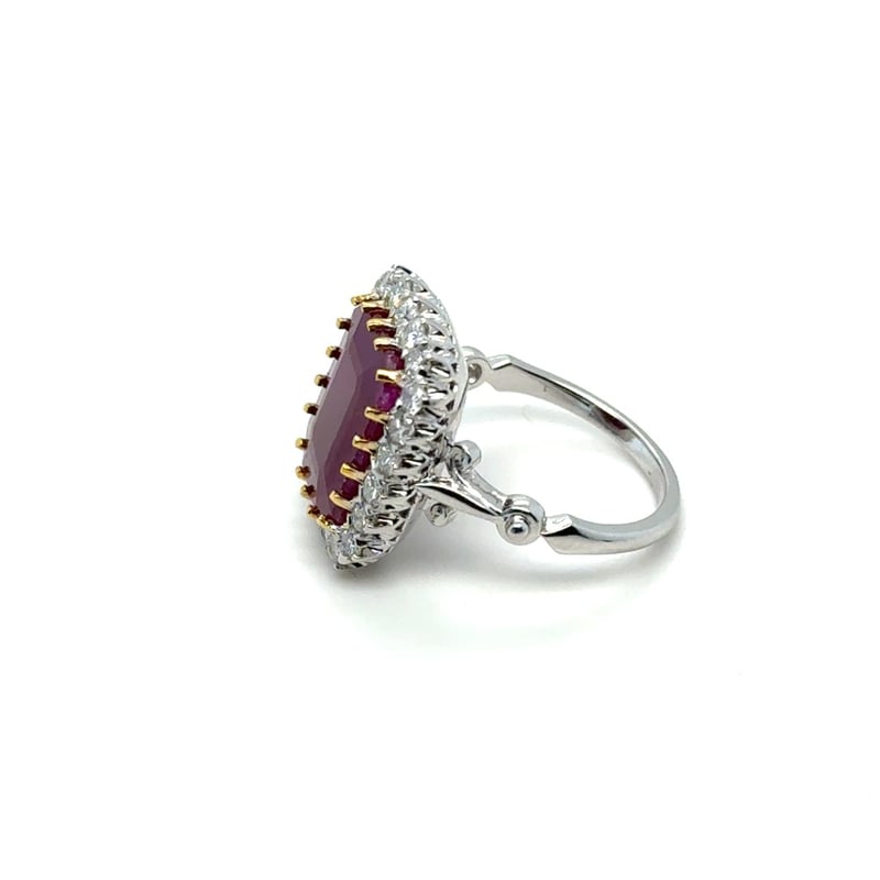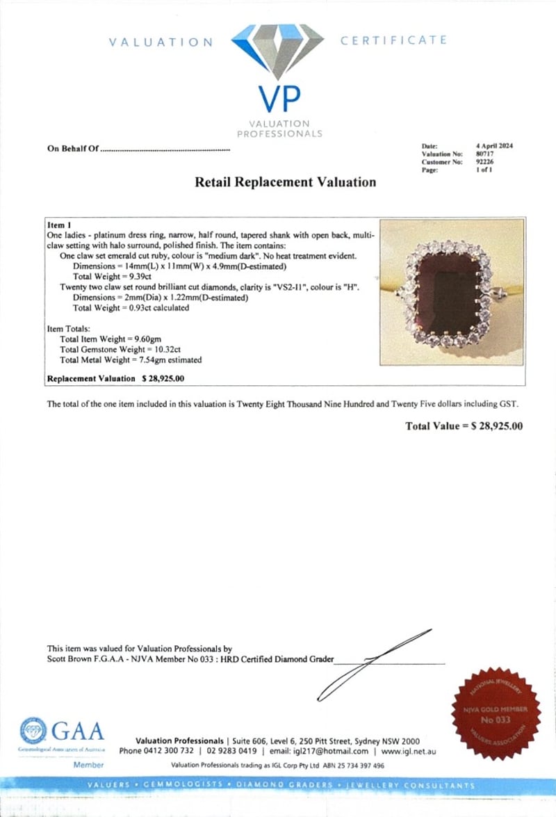 PLATINUM EMERALD CUT RUBY AND DIAMOND RINGR = 9.39CtD = 0.93CtVal #80717Condition: Good - Refer To ImagesThis valuation has been conducted by an independent third-party professional. The valuation amount is an assessment by the issuing valuer and does not reflect the auction value of the item.Any inquiries regarding the valuation should be directed to the issuing valuer (refer to contact details on the certificate), as Lloyds Auctions has no affiliation or influence over the valuation, the valuer, or the stated amount.Insurance Replacement Valuation Amount: $28,925.00488487+23