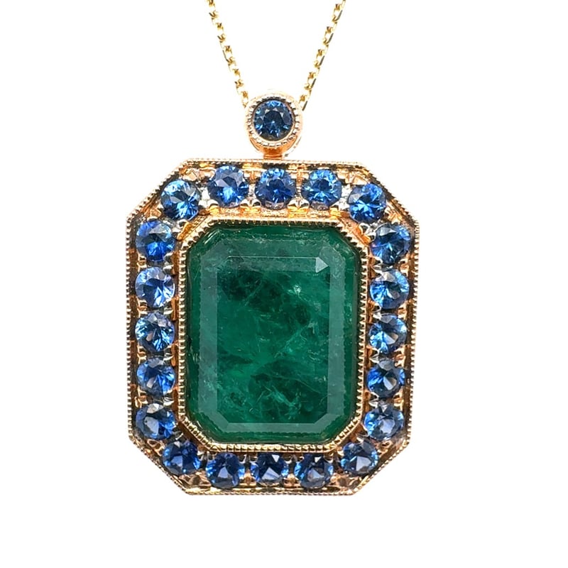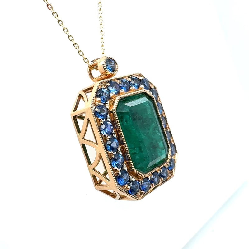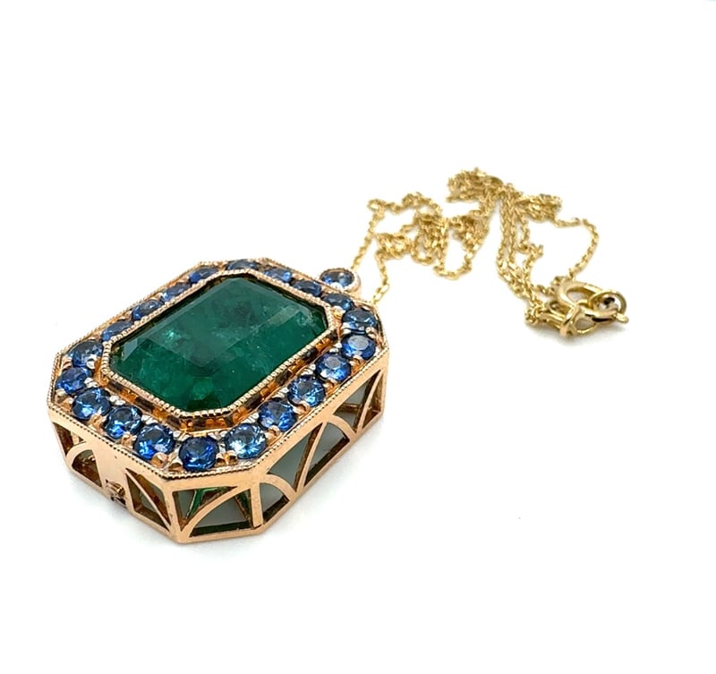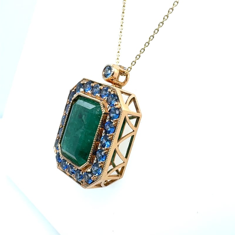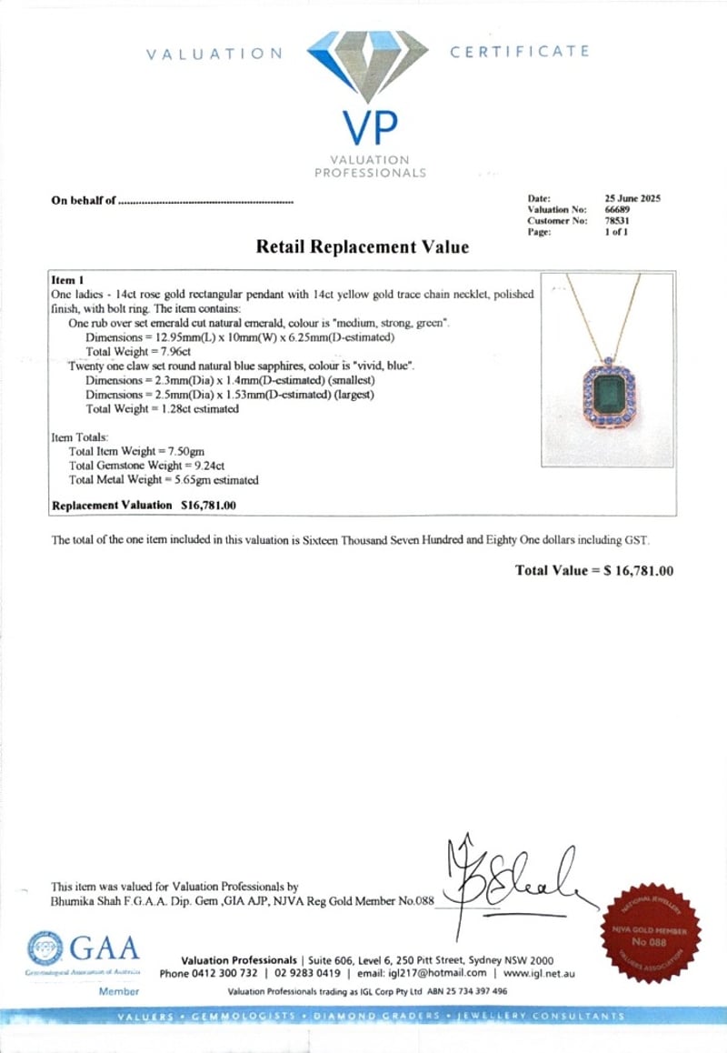 14CT ROSE GOLD EMERALD CUT EMERALD AND SAPPHIRE PENDANT NECKLACE