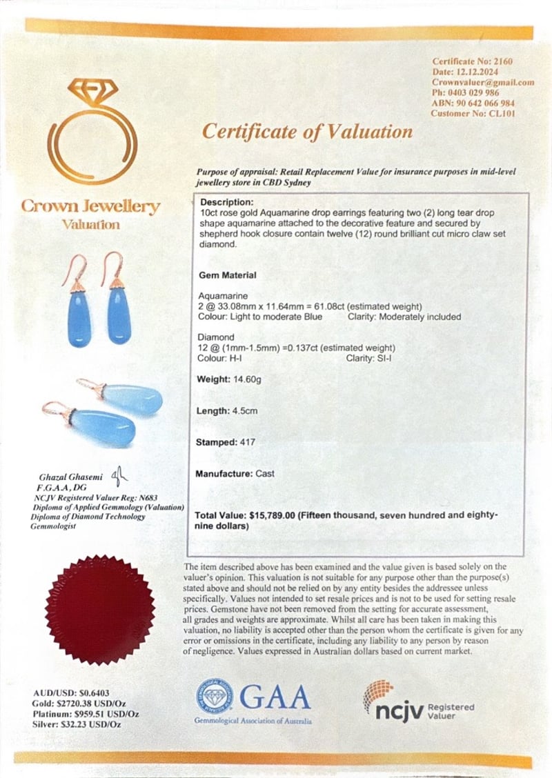 10CT ROSE GOLD TEAR DROP AQUAMARINE AND DIAMOND EARRINGS