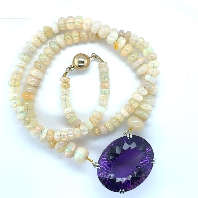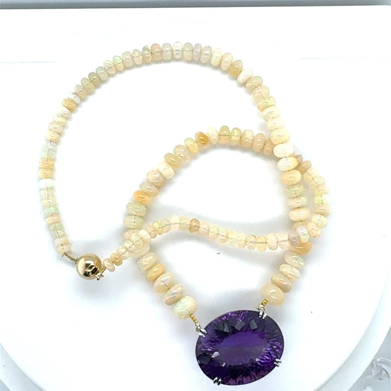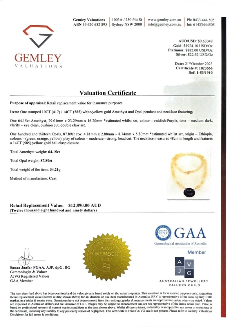 10CT & 14CT WHITE/YELLOW GOLD CUSHION CUT AMETHYST AND OPAL PENDANT NECKLACEA = 64.15CtO = 87.89CtVal #1023566Condition: Good - Refer To ImagesThis valuation has been conducted by an independent third-party professional. The valuation amount is an assessment by the issuing valuer and does not reflect the auction value of the item.Any inquiries regarding the valuation should be directed to the issuing valuer (refer to contact details on the certificate), as Lloyds Auctions has no affiliation or influence over the valuation, the valuer, or the stated amount.Insurance Replacement Valuation Amount: $12,890.00488487+115