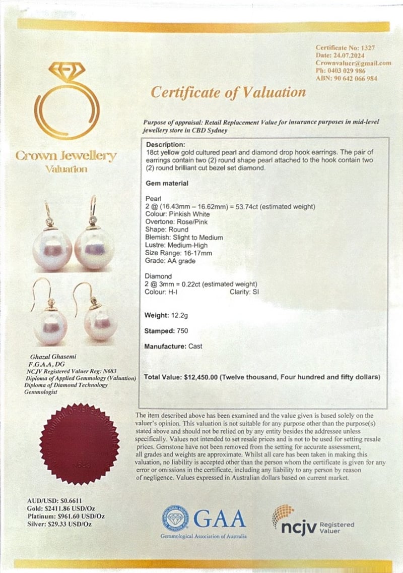18CT YELLOW GOLD DROP AND PEARL DROP HOOK EARRINGSD = 0.22CtP = 16-17MmVal #1327Condition: Good - Refer To ImagesThis valuation has been conducted by an independent third-party professional. The valuation amount is an assessment by the issuing valuer and does not reflect the auction value of the item.Any inquiries regarding the valuation should be directed to the issuing valuer (refer to contact details on the certificate), as Lloyds Auctions has no affiliation or influence over the valuation, the valuer, or the stated amount.Insurance Replacement Valuation Amount: $12,450.00488487+124