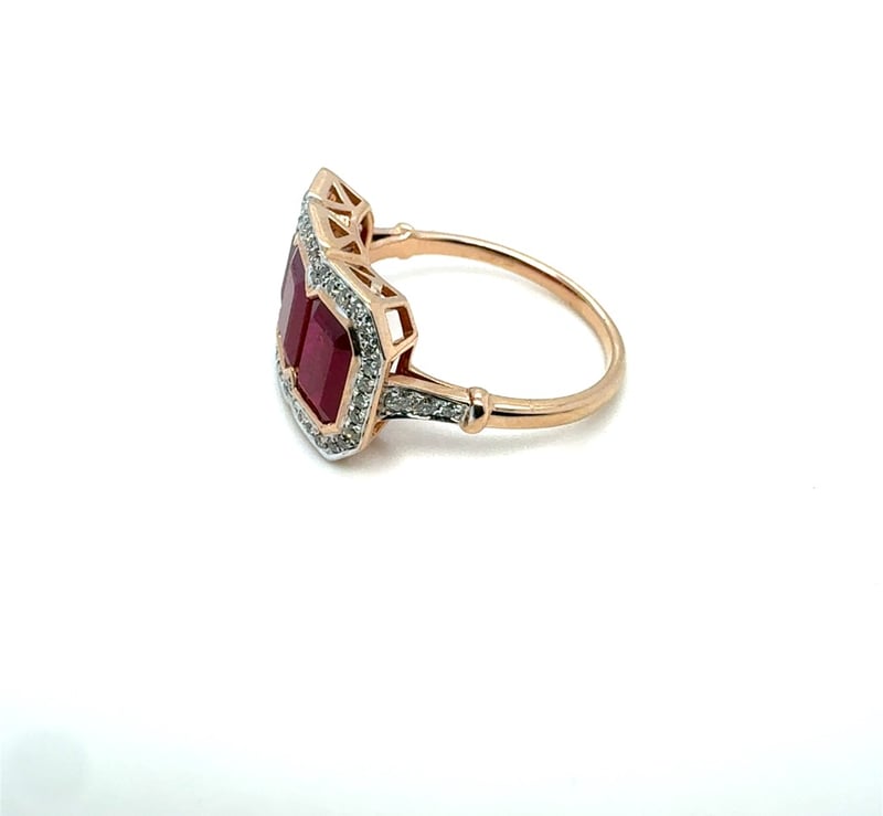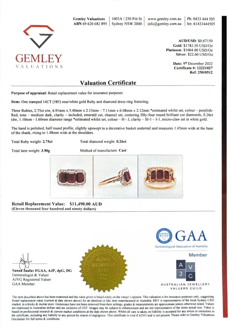 14CT ROSE/WHITE GOLD EMERALD CUT RUBY AND DIAMOND TRILOGY RINGR = 2.75CtD = 0.26CtVal #12221027Condition: Good - Refer To ImagesThis valuation has been conducted by an independent third-party professional. The valuation amount is an assessment by the issuing valuer and does not reflect the auction value of the item.Any inquiries regarding the valuation should be directed to the issuing valuer (refer to contact details on the certificate), as Lloyds Auctions has no affiliation or influence over the valuation, the valuer, or the stated amount.Insurance Replacement Valuation Amount: $11,490.00488487+16