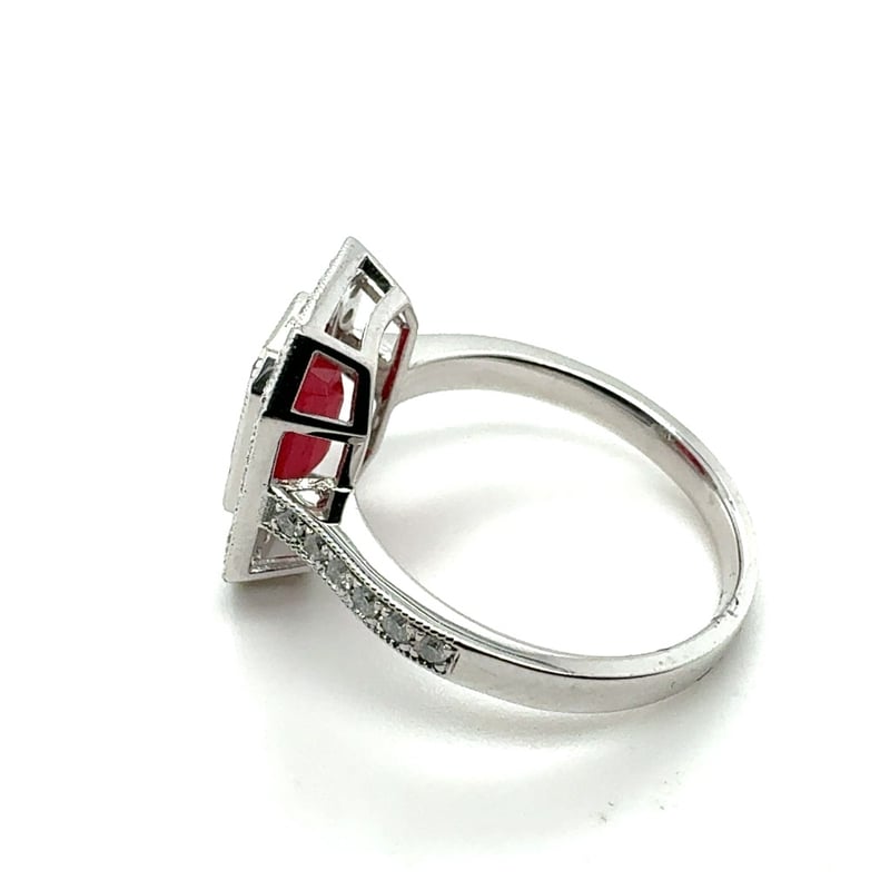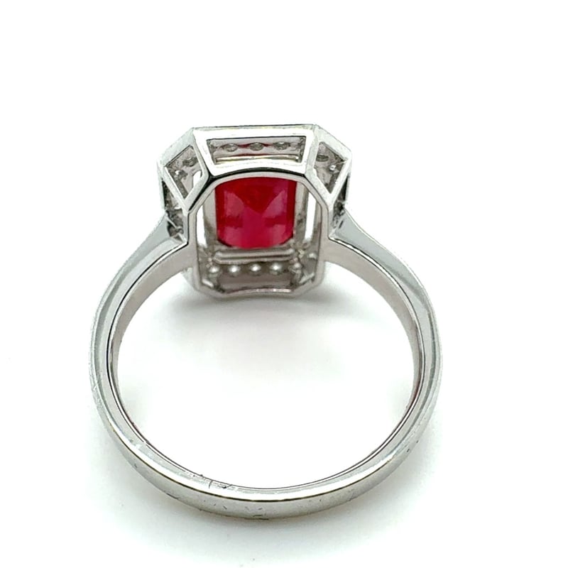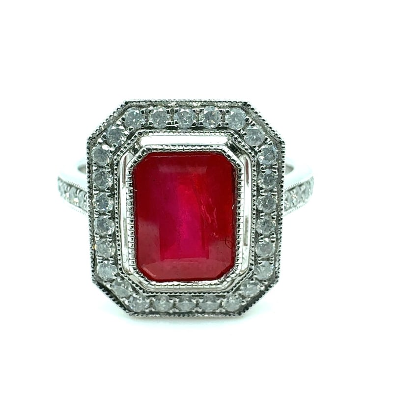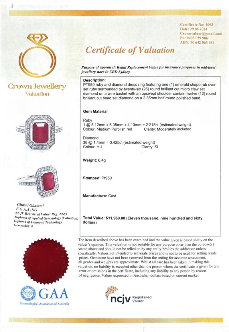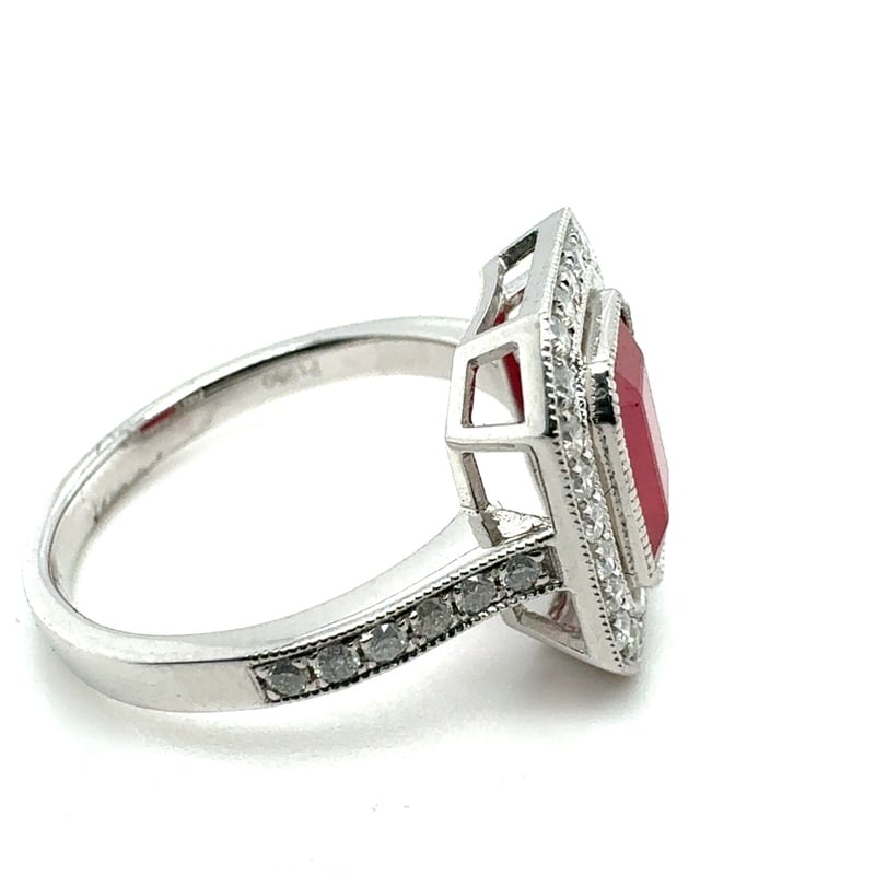 PT950 EMERALD CUT RUBY AND DIAMOND RING