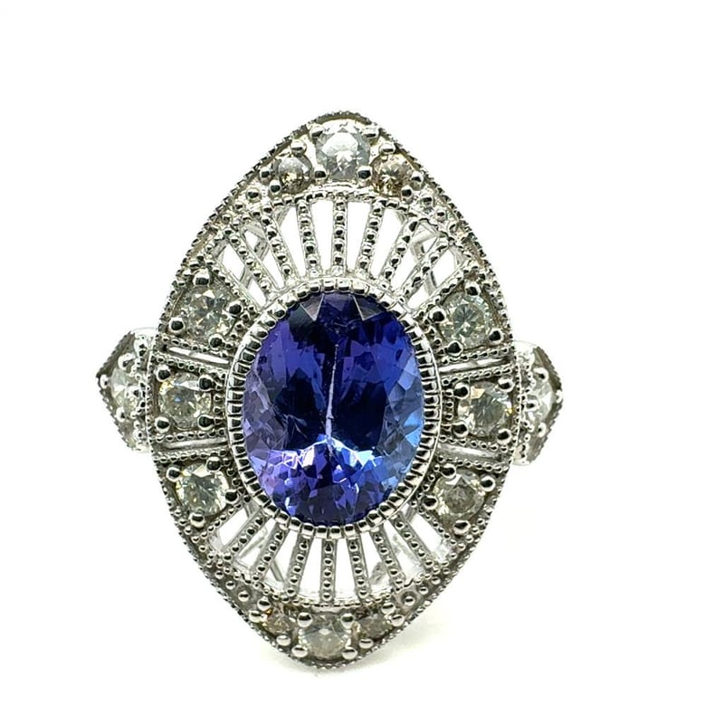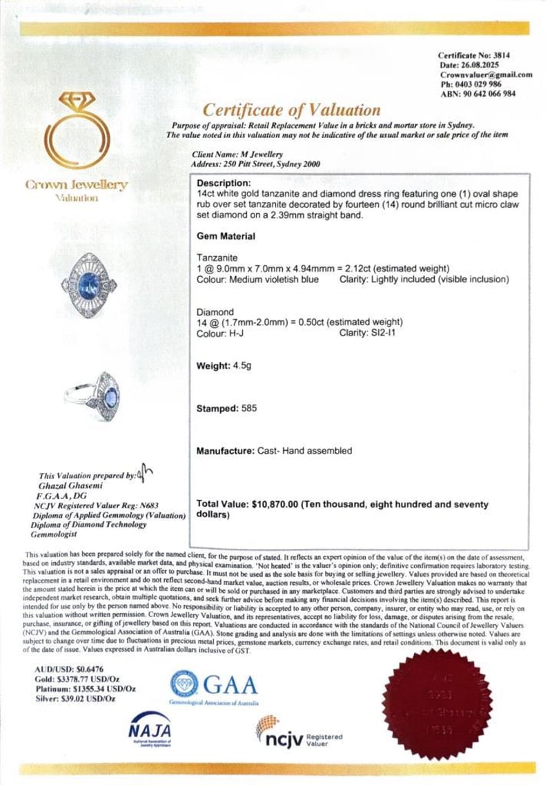 14CT WHITE GOLD OVAL CUT TANZANITE AND DIAMOND RINGT = 2.12Ct D= 0.50CtVal #3814Condition: Good - Refer To ImagesThis valuation has been conducted by an independent third-party professional. The valuation amount is an assessment by the issuing valuer and does not reflect the auction value of the item.Any inquiries regarding the valuation should be directed to the issuing valuer (refer to contact details on the certificate), as Lloyds Auctions has no affiliation or influence over the valuation, the valuer, or the stated amount.Insurance Replacement Valuation Amount: $10,870.00488487+98
