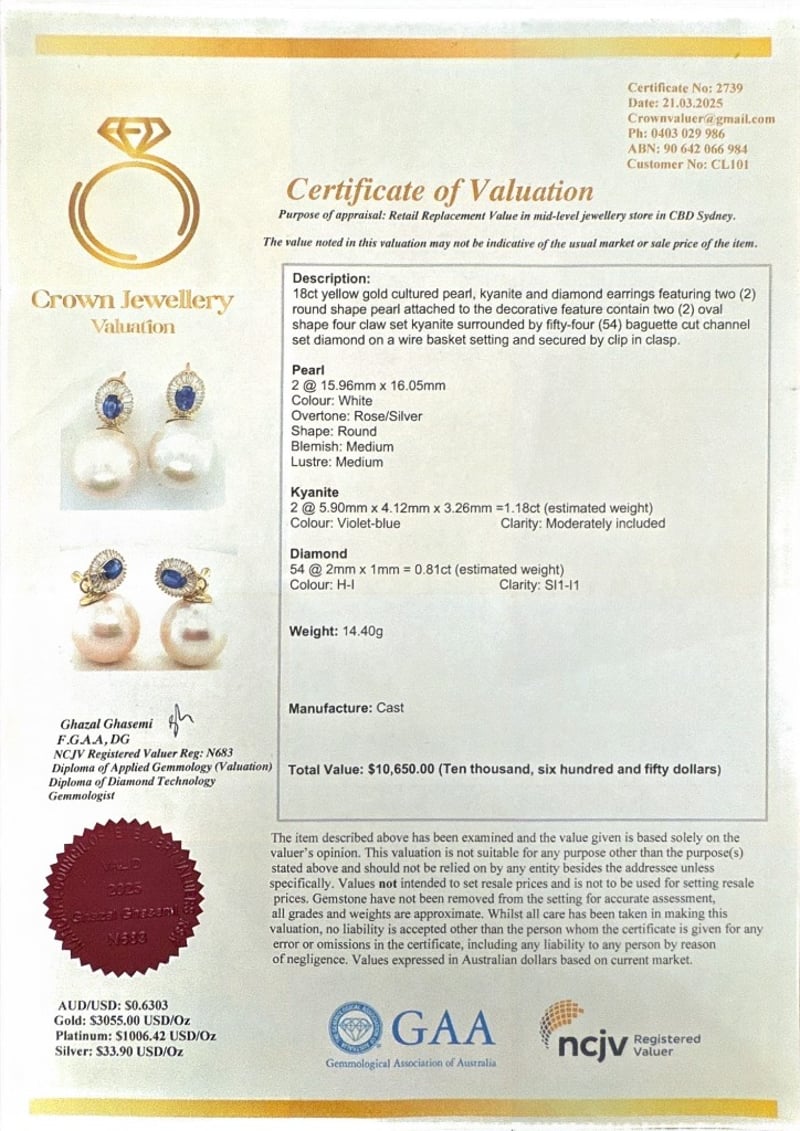 18CT YELLOW GOLD OVAL CUT KYANITE, DIAMOND AND PEARL EARRINGSK= 1.18Ct D = 0.81CtVal #2739Condition: Good - Refer To ImagesThis valuation has been conducted by an independent third-party professional. The valuation amount is an assessment by the issuing valuer and does not reflect the auction value of the item.Any inquiries regarding the valuation should be directed to the issuing valuer (refer to contact details on the certificate), as Lloyds Auctions has no affiliation or influence over the valuation, the valuer, or the stated amount.Insurance Replacement Valuation Amount: $10,650.00488487+123